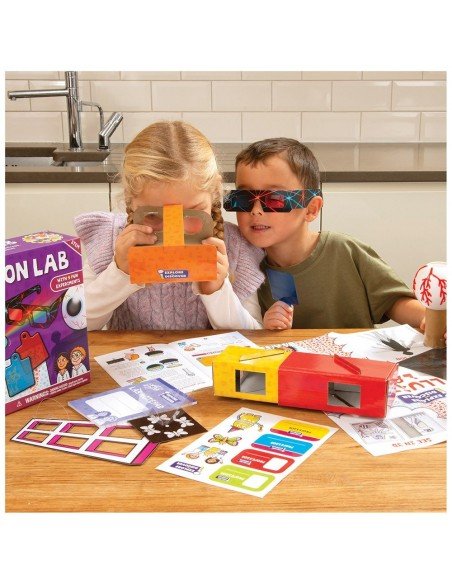 Išbandykite periskopą , kad apžiūrėtumėte kamous, suraskite paslėptus piešinius ir pamatykite vaizdus 3D formate. Sudėkite akies modelį, sukurkite judančius piešinius ir parodykite paslaptingus triukus savo draugams ir šeimai. Rinkinyje yra 9 eksperimentai. Sudėtis:akies obuolio plastikinės dalys, kartoninis vamzdis, akių lęšiai, 2 x stereoskopiniai lęšiai, 2 x periskopo kartoniniai vamzdeliai, popierinis šiaudelis, 3D akiniai, 2 x periskopo veidrodėliai, stereoskopo kartoninės dalys, projektoriaus objektyvas, siurbtukas, plastikinis kamštelis, raudonos ir mėlynos spalvos ekranėliai, Juodas drižuotas plastikinis lapas, Zootropo (animacijos) paveislų juostelės, zootropo kartoninės detalės, nailoninis siūlas, kartoninė lango detalė, lipdukų lapas, užrašų knygelė, projektoriaus kart. detalė, A3 plakatas.
