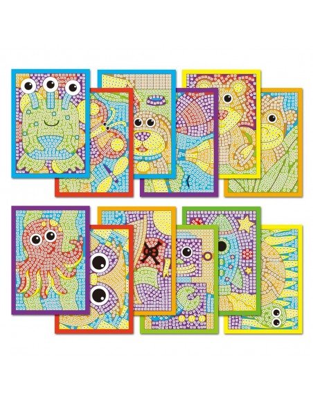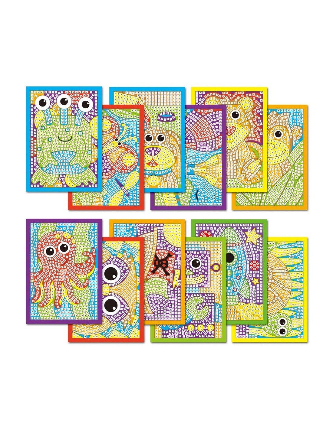 Pagaminkite 12 linksmų mozaikų iš spalvotų plytelių. Tiesiog prilipdykite plyteles prie joms atitinkančių numerių paveiksluose. Nulupkite apsauginį sluoksnį nuo plytelių ir priklijuokite prie paveikslų. Sudėtis: 20 lapų su virš 7500 lipnių 6mm, storio plytelių, 12 paveikslų su numeriais (25x18cm dydžio), instrukcija lietuvių kalba.