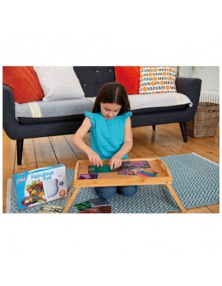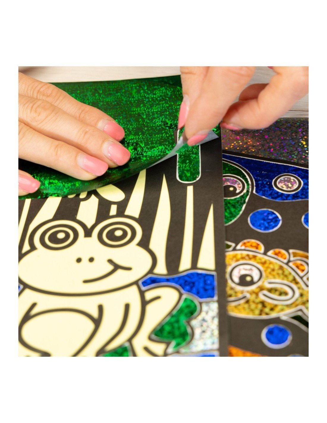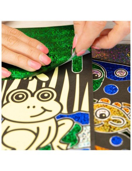 Padarykite 12 blizgančių paveikslėlių su šiuo folijos meno rinkiniu. Tiesiog nuimkite paveiksliuko dalį dengiantį popierių, padėkite ant jos foliją ir patrinkite pirštu. Pakelkite pridėtos folijos lapą ir jos spalva persikels ant lipnaus paveiksliuko paviršiaus. Sudėtis: 40 folijos lapų, 12 paveikslėlių (18x12.5 cm), 2 lapai su 25 lipdukais, instrukcija.