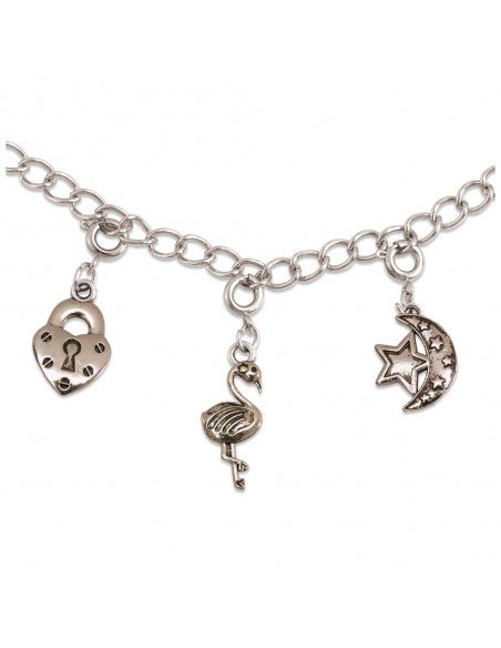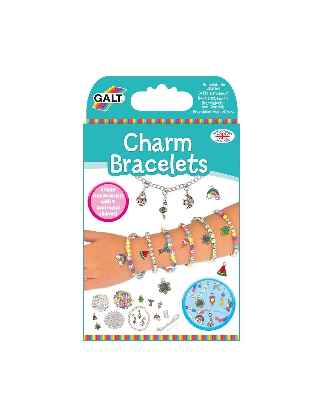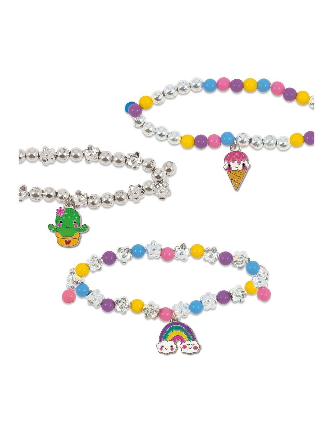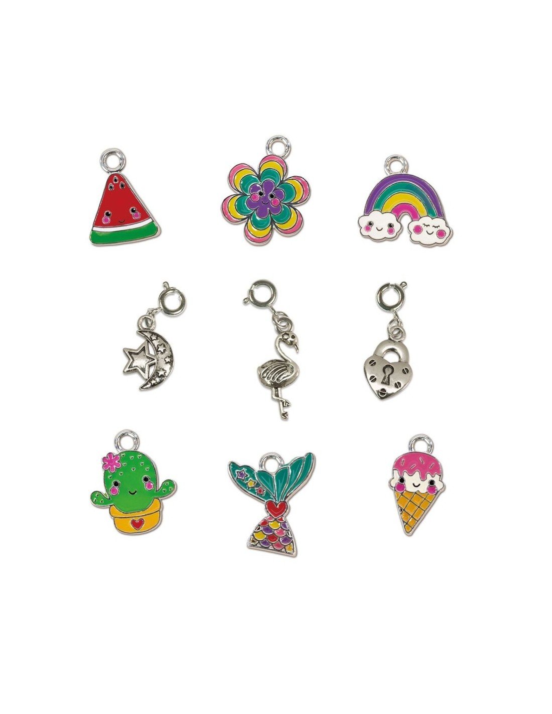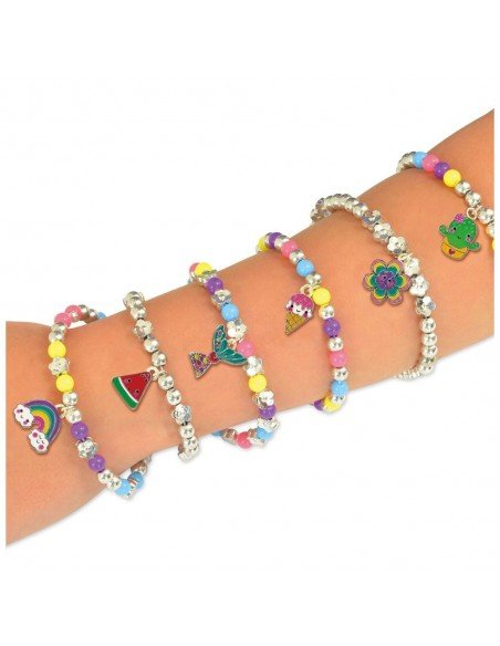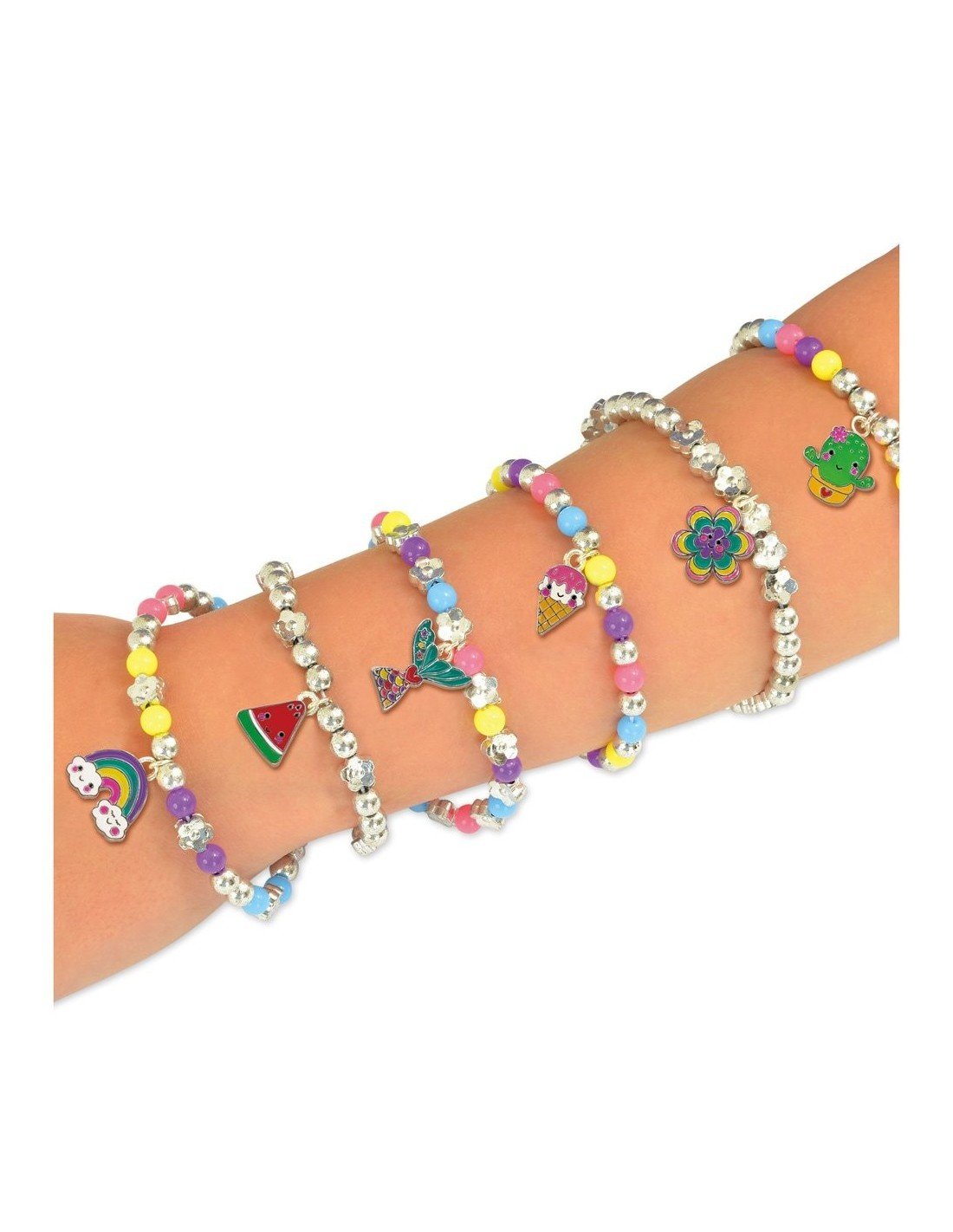 Pasidaryk 7 apyrankes su metaliniais pakabukais. Tiesiog prisek pakabuką prie apyrankės grandinėlės. Suverk sidabrinius ir spalvotus karoliukus ant elastinio siūlo ir uždėk spalvotą pakabuką. Sudėtis: 6 spalvoti metaliniai pakabukai, 3 sidabriniai pakabukai su prisegimais,apyrankės grandinėlė, 300 spalvotų ir sidabrinių karoliukų, elastinis siūlas,adata, siūlas, instrukcija