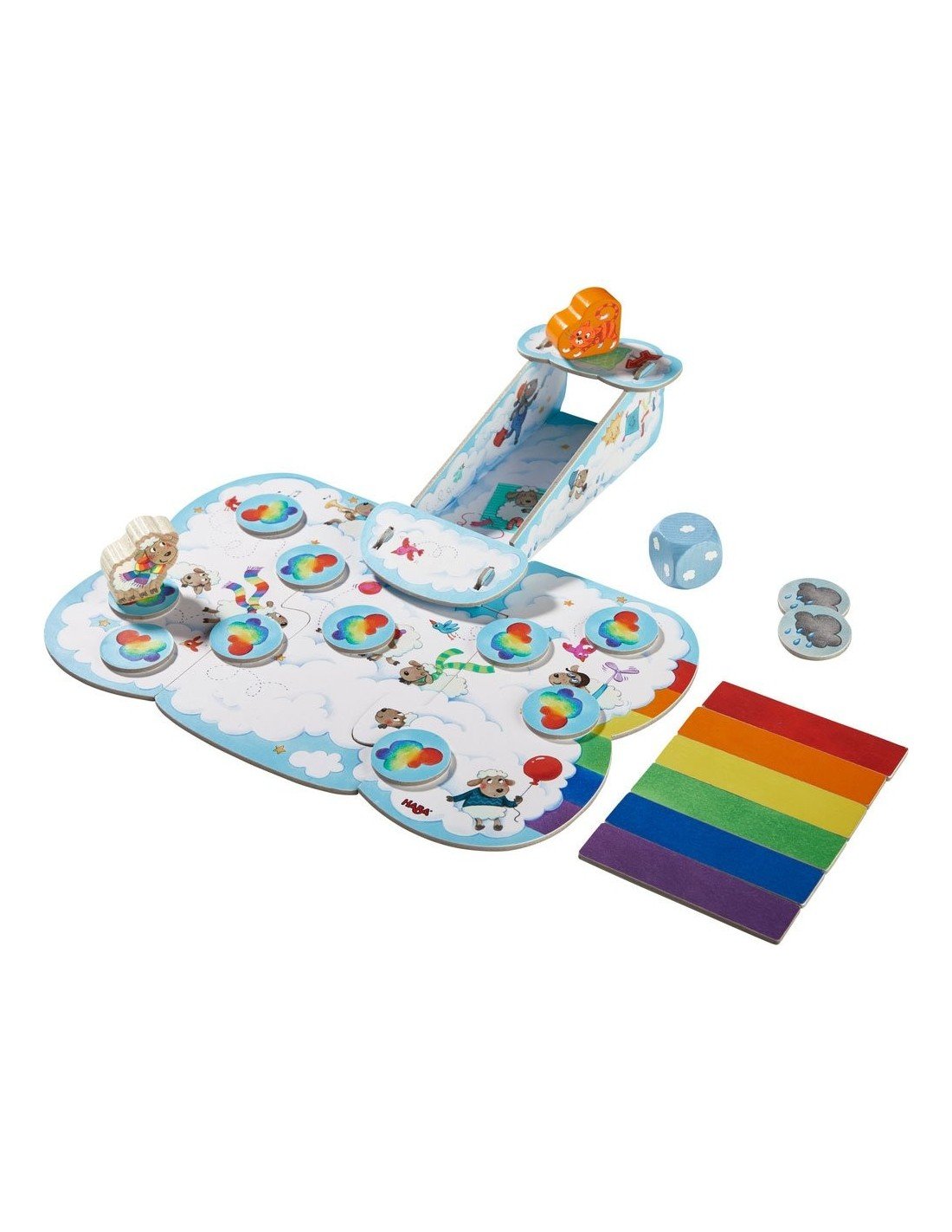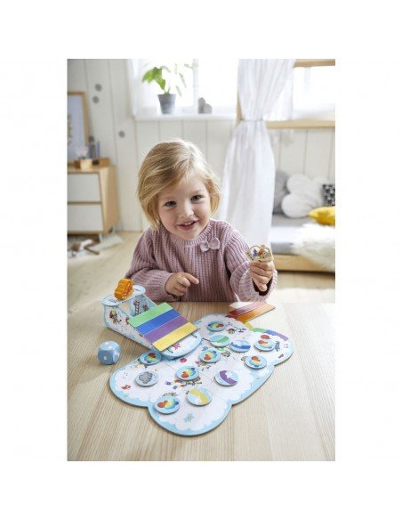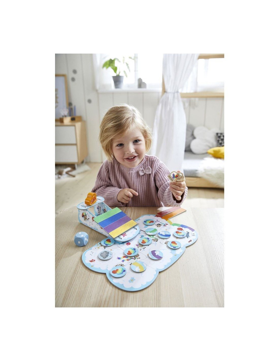 Laisvame žaidime jūsų vaikas susikoncentruoja ant žaidimo komponentų. Kodėl gi neprisijungti? Patyrinėkite paveikslėlius kartu - vaivorykštinę čiuožyklą,dangų ir gyvūnėlius. Įdėmiai apžiūrėkite žaidimo komponentus ir jų iliustracijas.Pakalbėkite apie dangų, saulę, baltus debesis, lietų ir vaivorykštę. Papasakokite vaikui ką bendro jie turi.