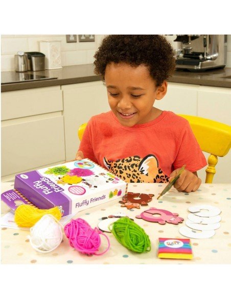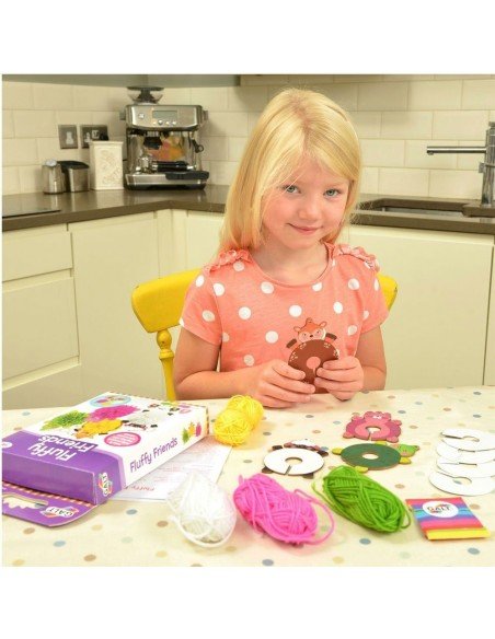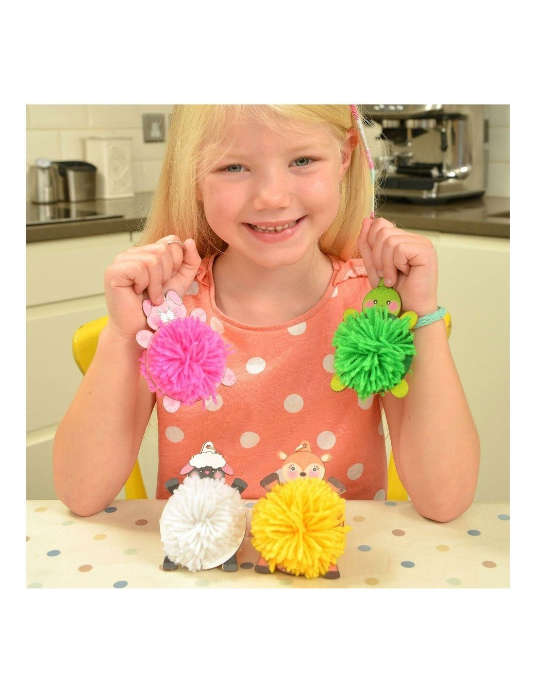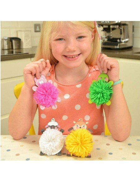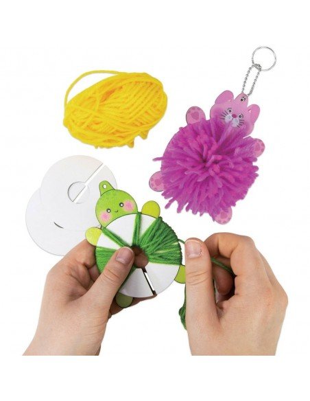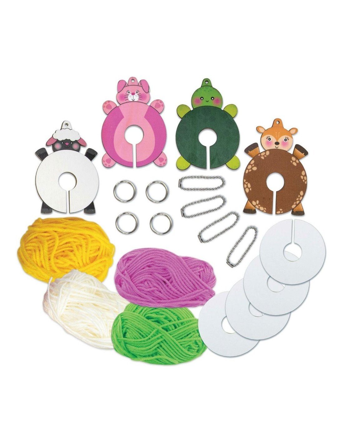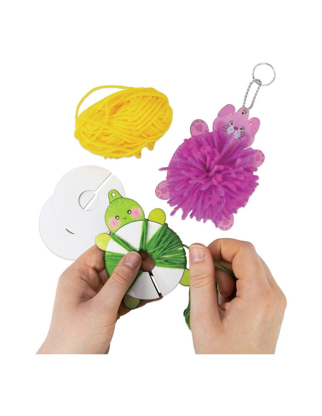 Sukurkite 4 pūkuotus pakabukus iš vilnos, pasinaudodami gyvūnėlių šablonais.Apvyniokite gyvūnėlio šablona vilna, prakirpkite šonus sukurdami pomponiuką ir pritvirtinkite raktų pakabuką. Sudėtis: 4 mediniai gyvūnėlių šablonai, 4 vilnos ritinėliai, 4 kartoniniai apskritimai, 4 raktų pakabukų žiedai ir 4 grandinėlės.