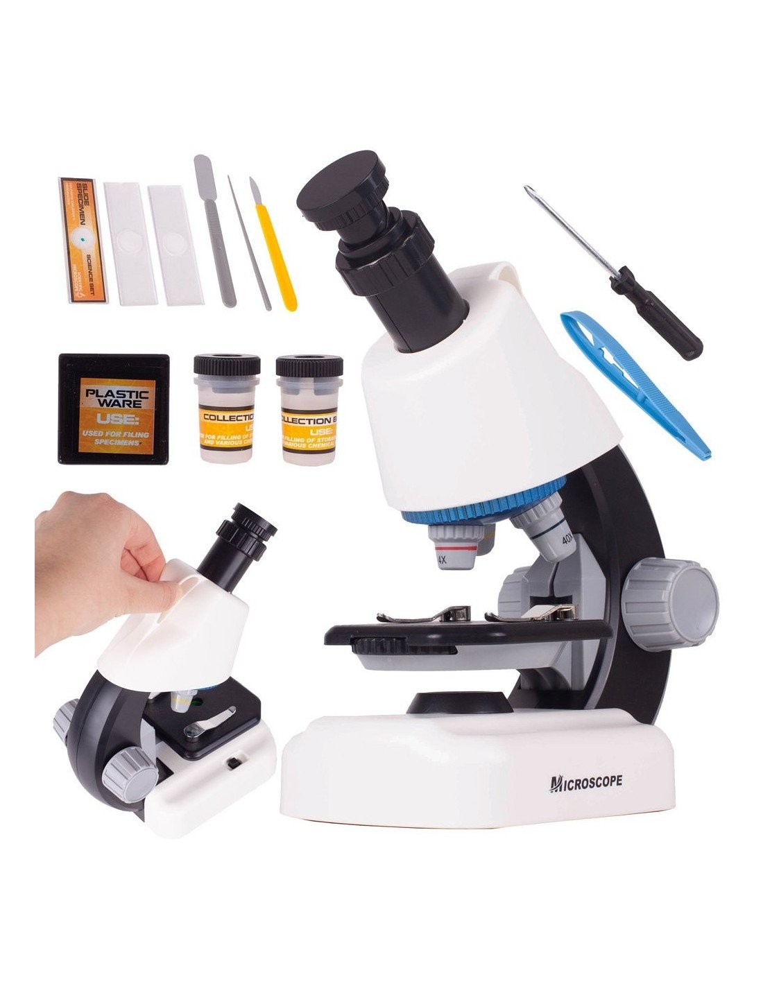 Mikroskopas 16.3 x 10 x 21.8cm su priedais. Padidinimas 4x, 10x 40x . Maksimalus padidinimas 640x
