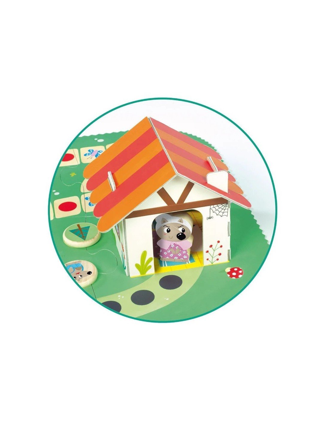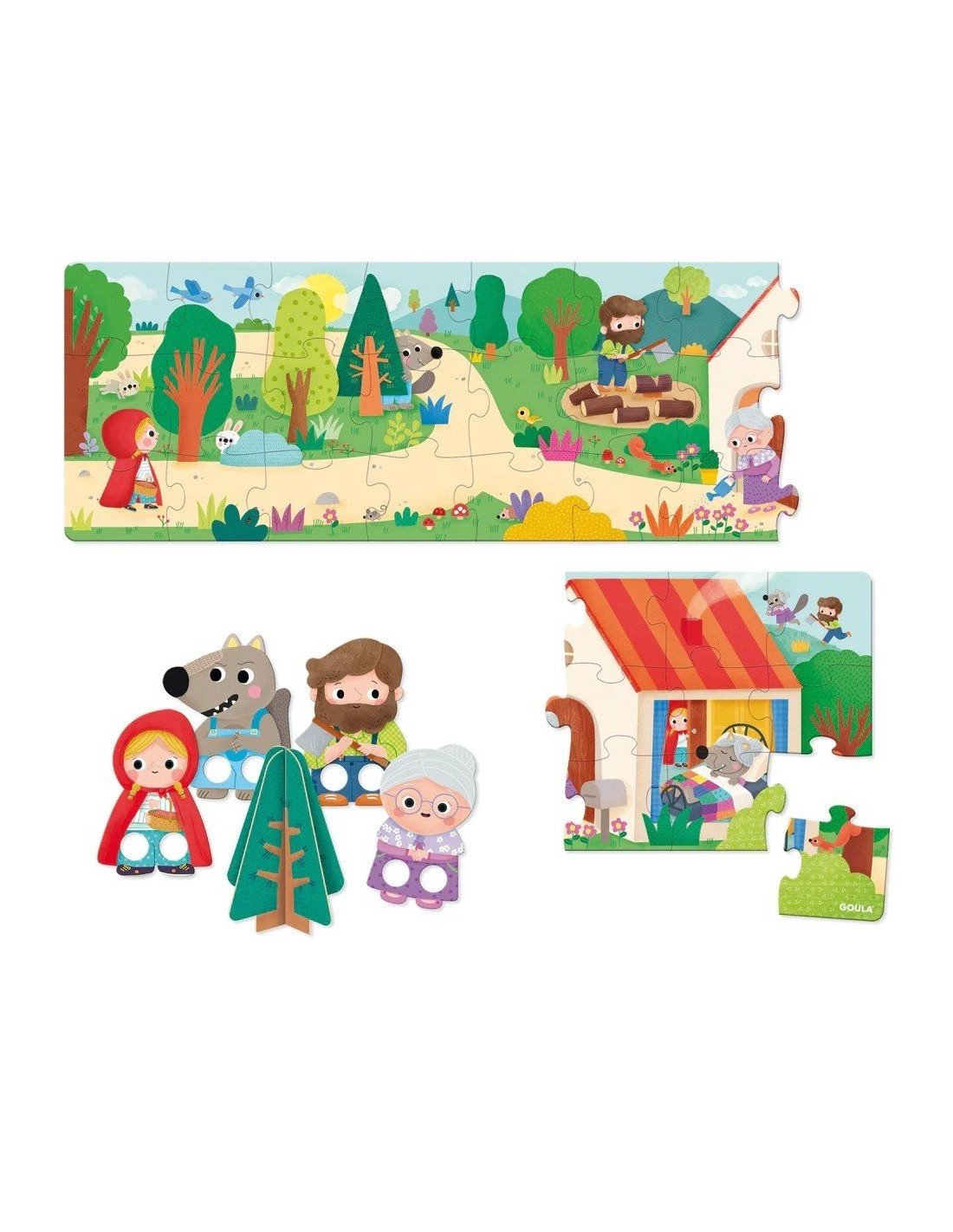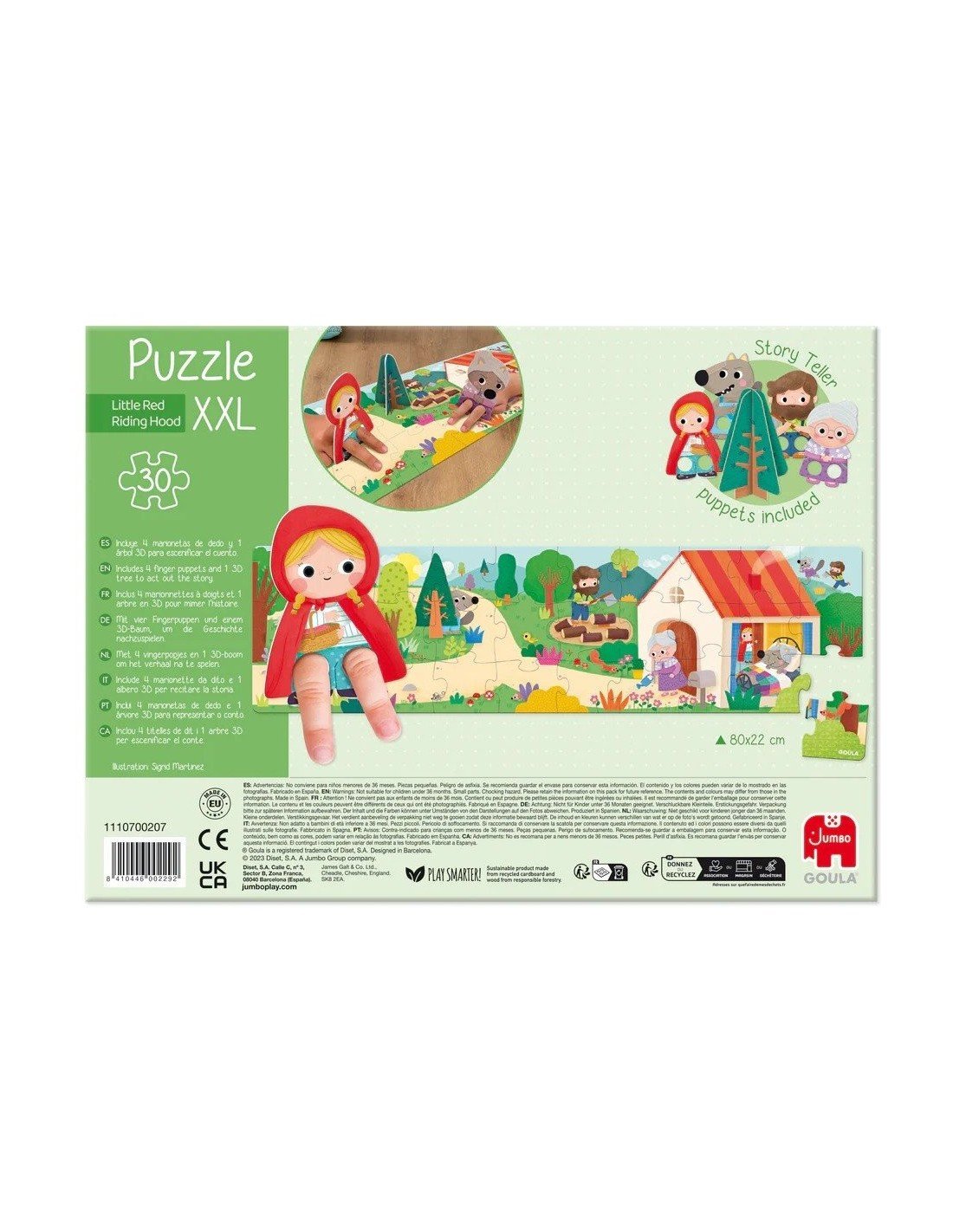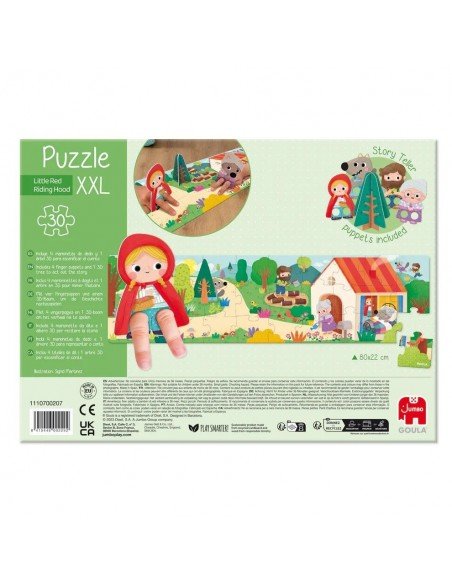 Didelė dėlionė su XXL dydžio detalėmis (30vnt), Raudonkepuraitės tematika.Produktas sujungia dvi veiklas : dėlionę, kurią reikia sudėti, ir pasaką, kurią vaikams reikia perskaityti.Skirta vaikams nuo 3 metų. Dėlionės išmatavimai:80 x 22cm
