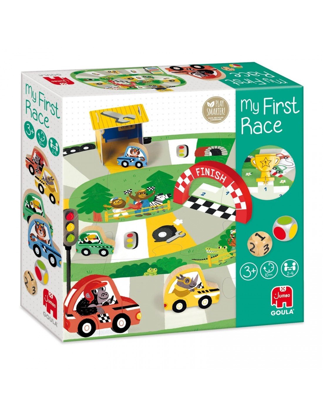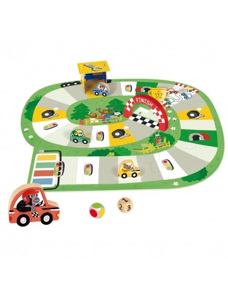 Pasiek finišą pirmas. Ridenk kaulelius ir važiuok pirmyn. Žaidimas skirtas 2 - 4 žaidėjams nuo 3 metų. Trukmė: apie 10min. Sudėtis:9-ių dalių žaidimo laukas-dėlionė; 3D serviso garažas; taurė; 4 mašinos; 1 finišo arka; 1 kaulelis su skaičiais ir 1 kaulelis su spalvomis.
