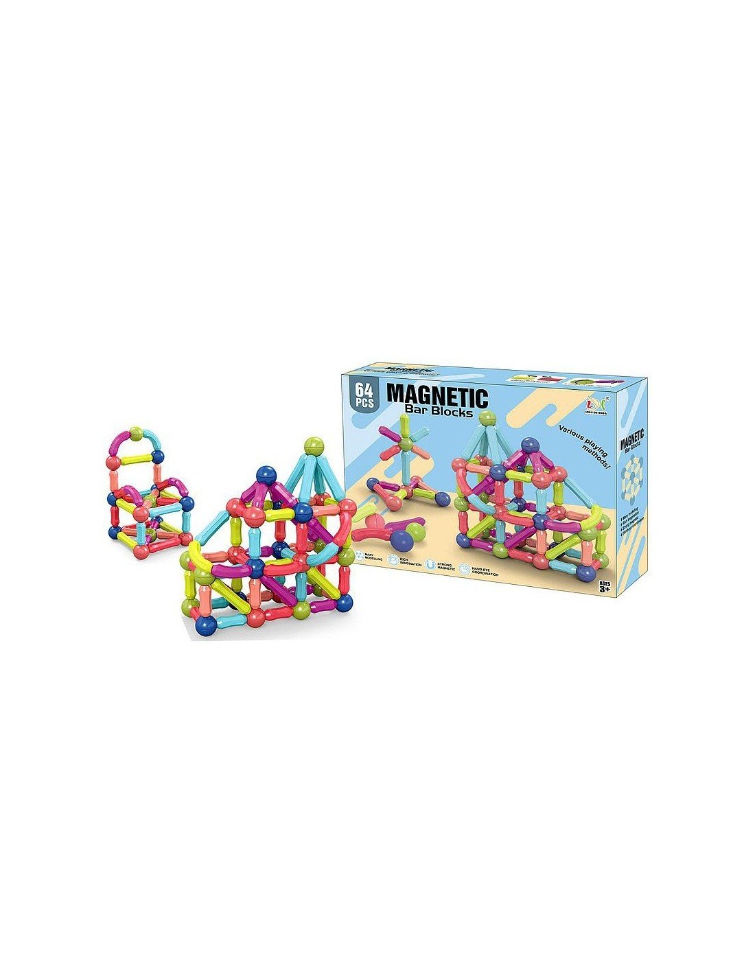 Magnetinis konstruktorius Bar Blocks, 64 det., pagaliukai 5x2cm,6.5x2cm,8.5x2cm, kamuoliukas 3.5cm