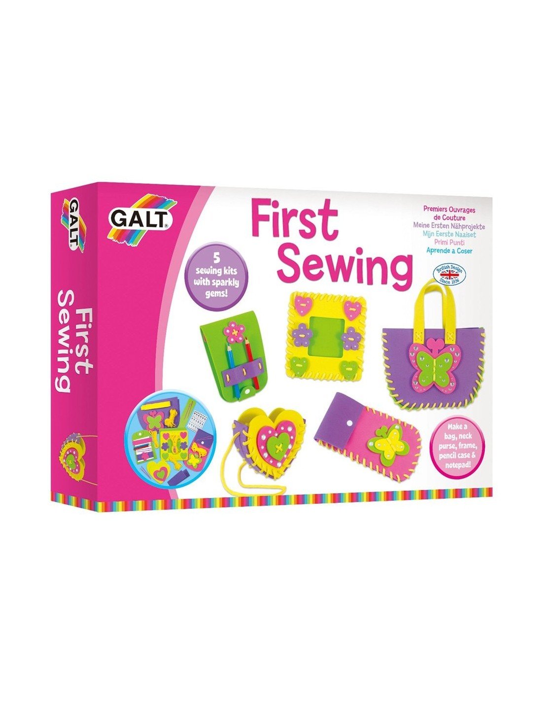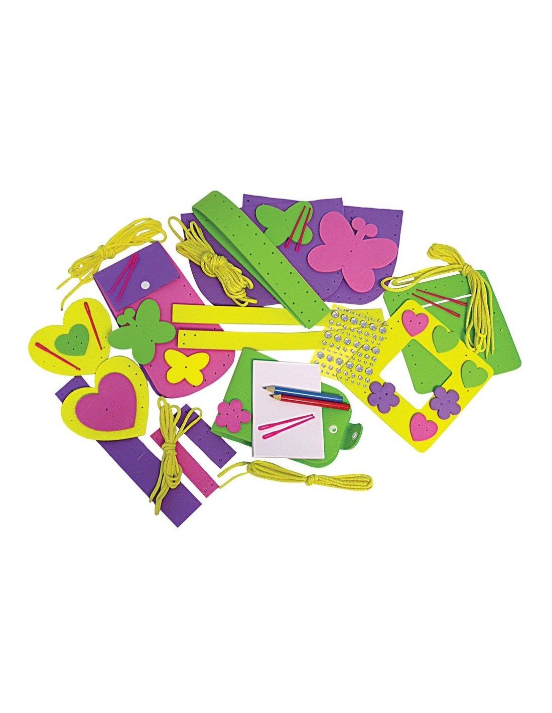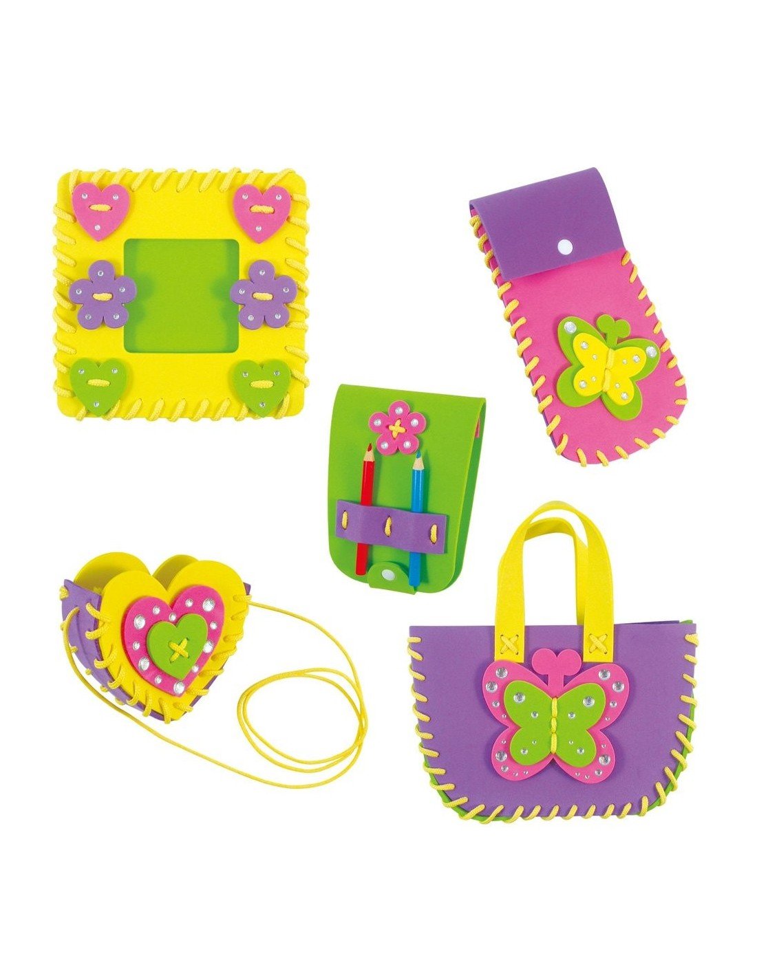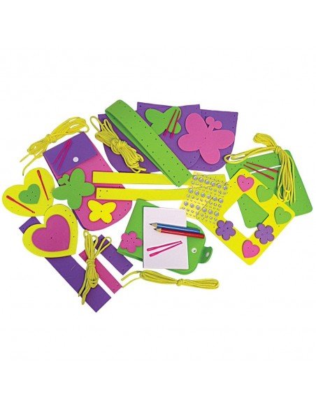 Sudėtis: 5 siuvimo rinkiniai ir siūlas, plastikinė adata, blizgučiai su lipniu pagrindu, užrašų lapeliai, 2 pieštukai.