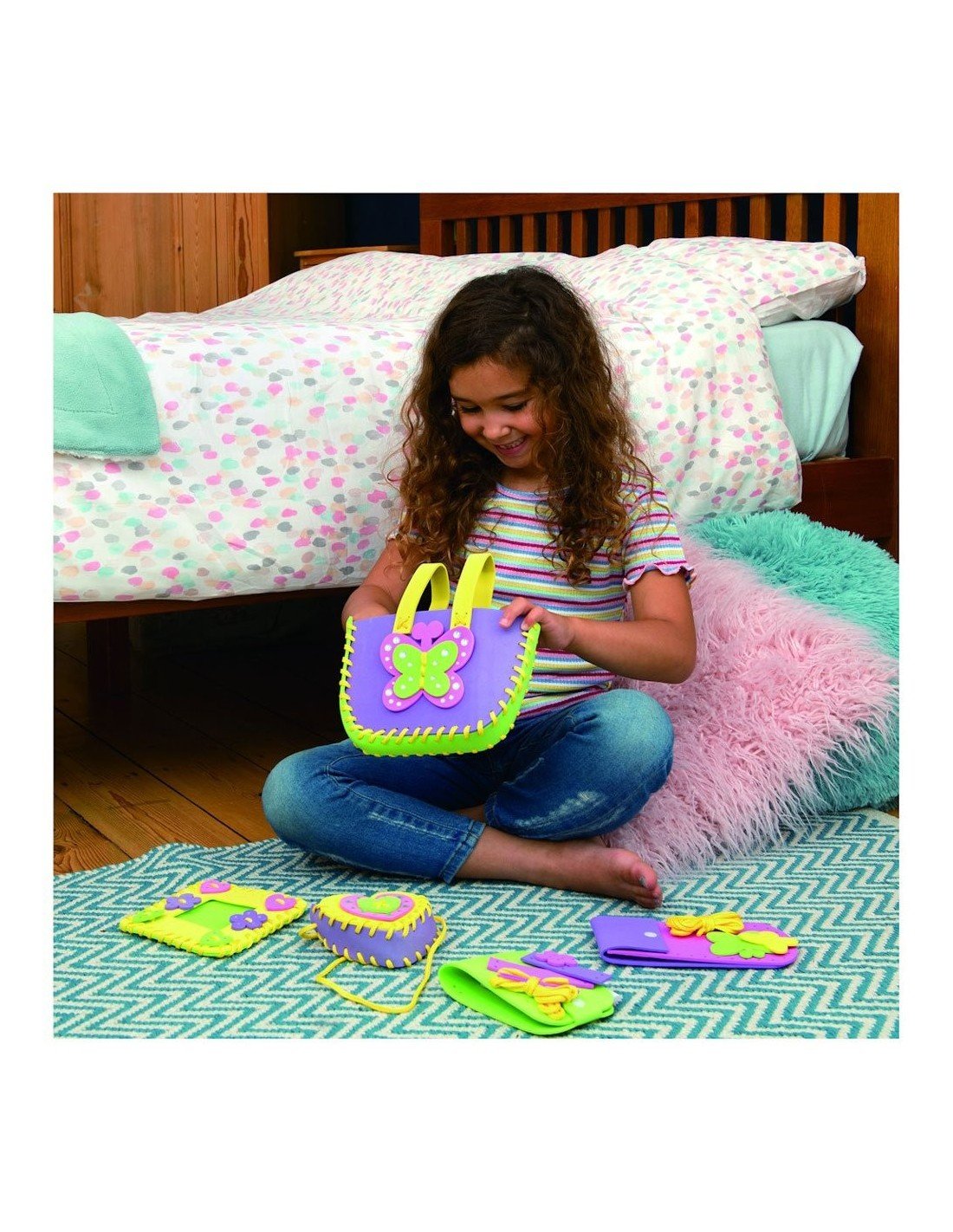 Pasidaryk rankinuką su drugeliu, pakabinamą piniginę. Nuotraukos rėmelį, aplankalą užrašų lapeliams ir dėkliuką pieštukams. Susiuk detales su skylutėmis specialiu siūlu ir papuošk įvairom formom ir blizgučiais su lipniu pagrindu.