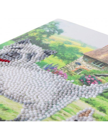 2.Padėkite šalia darbo įrankius. Švelniai įspauskite dėliojimo pieštuką į minkšto vaško kvadratėlį taip, kad dalis vaško liktų jo viduje. Suberkite vieno maišelio kristalus į lėkštutę. Pakelkite apsauginę foliją ant piešinio, bet nenuimkite jos pilnai.