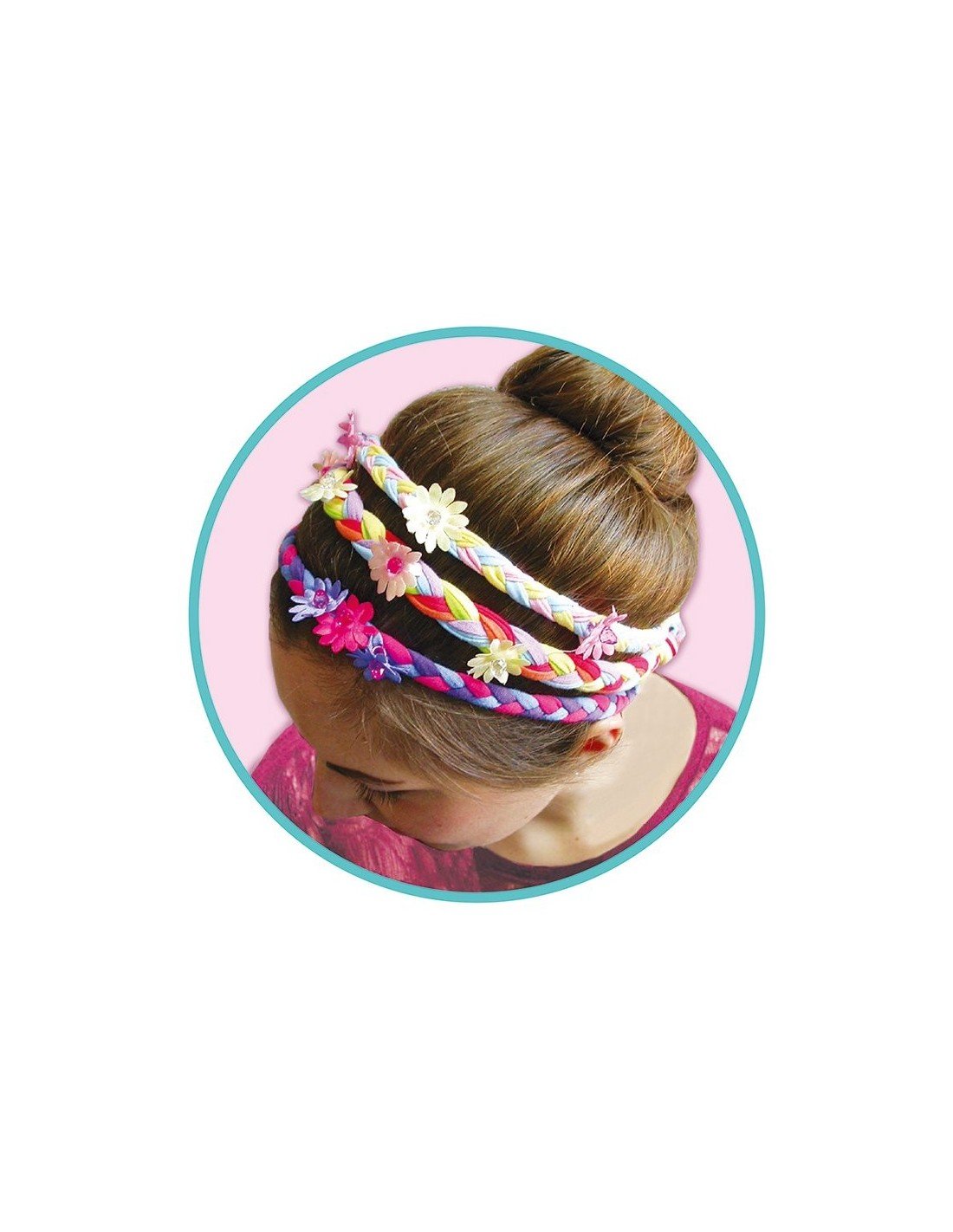 Pagaminkite 8 supintas juosteles plaukams, iš spalvotų medžiagų su gelėmis ir karoliukais. Tiesiog uždėkite gėles ir karoliukus pinant ir pririškite juosteles prie gumytės. Nieko nereikia siūti. Sudėtis: 30 medžiagų asortimentas, 25 medžiaginės gėlės, 25 karoliukai, 8 gumytės, instrukcija lietuvių kalba.