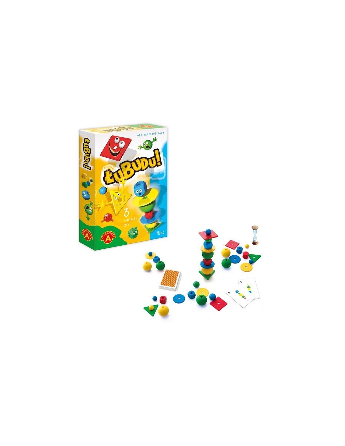 Sudėtis: maži rutuliukai – 4 vnt.; vidutiniai rutuliukai – 4 vnt.; dideli rutuliukai – 4 vnt.; kauleliai – 4 vnt.; žetonai apskritimai – 2 vnt.; žetonai kvadratai – 2 vnt.; etonai trikampiai – 2 vnt.; užduočių kortos – 16 vnt.; smėlio laikrodis.