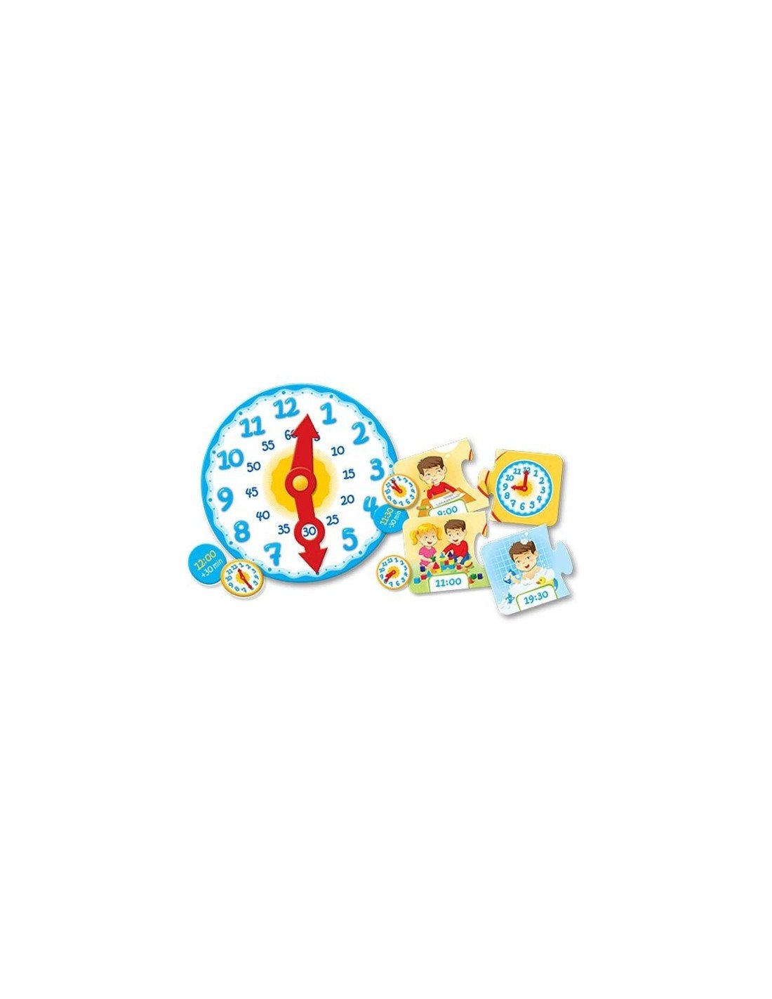 Pakuotėje rasite 9 dvipuses korteles-dėliones, laikrodį su judančiomis rodyklėmis ir papildomas dalis praturtinančias žaidimą.