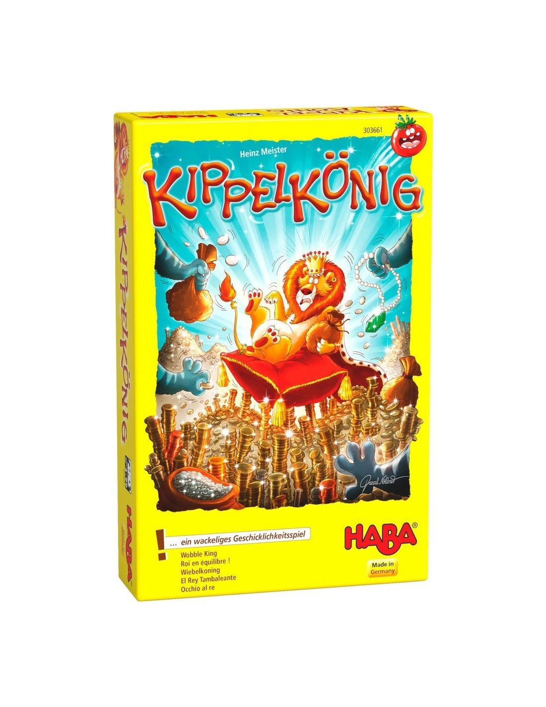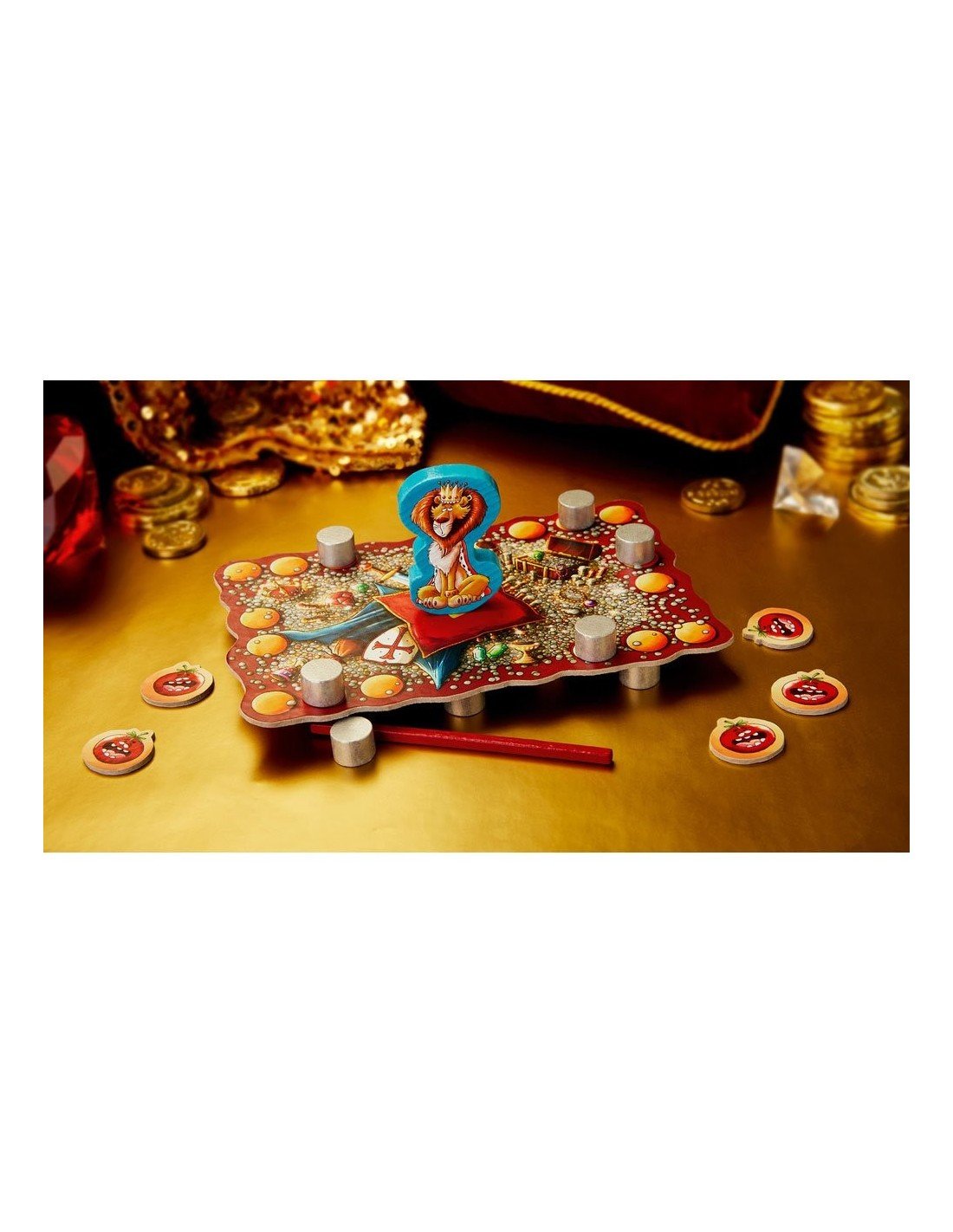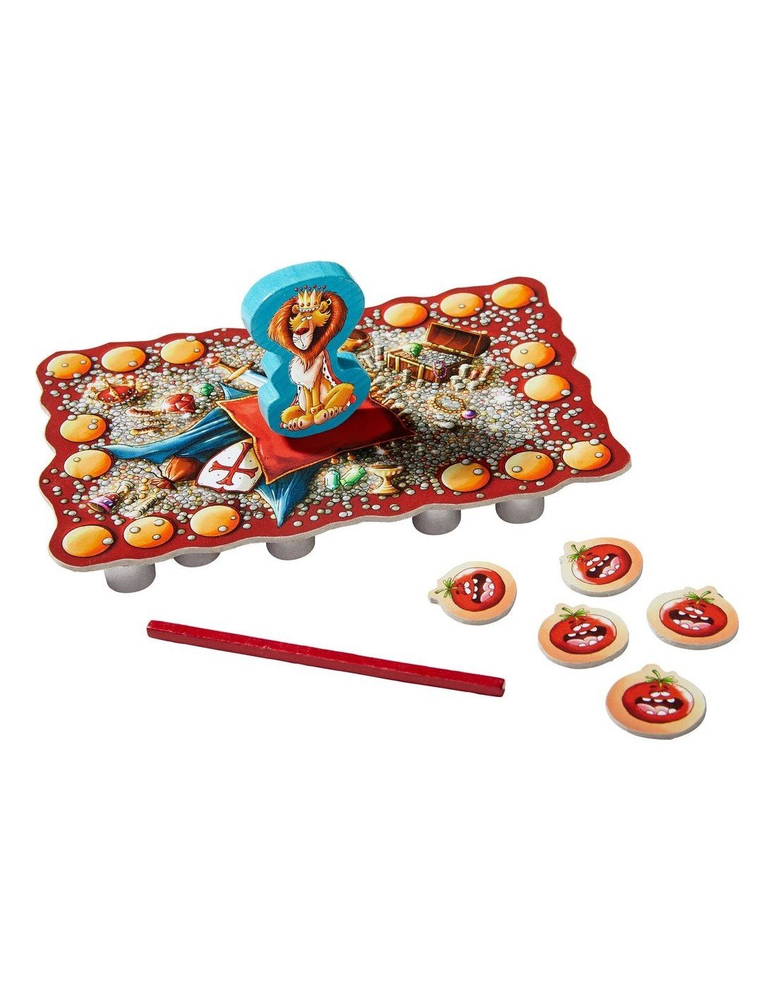 1 žaidimo laukas; 1 Karaliaus Leo medinė figūrėlė; 18 sidabrinių grynuolių; 1 medinė lazdelė; 5 pomidorų žetonėliai.