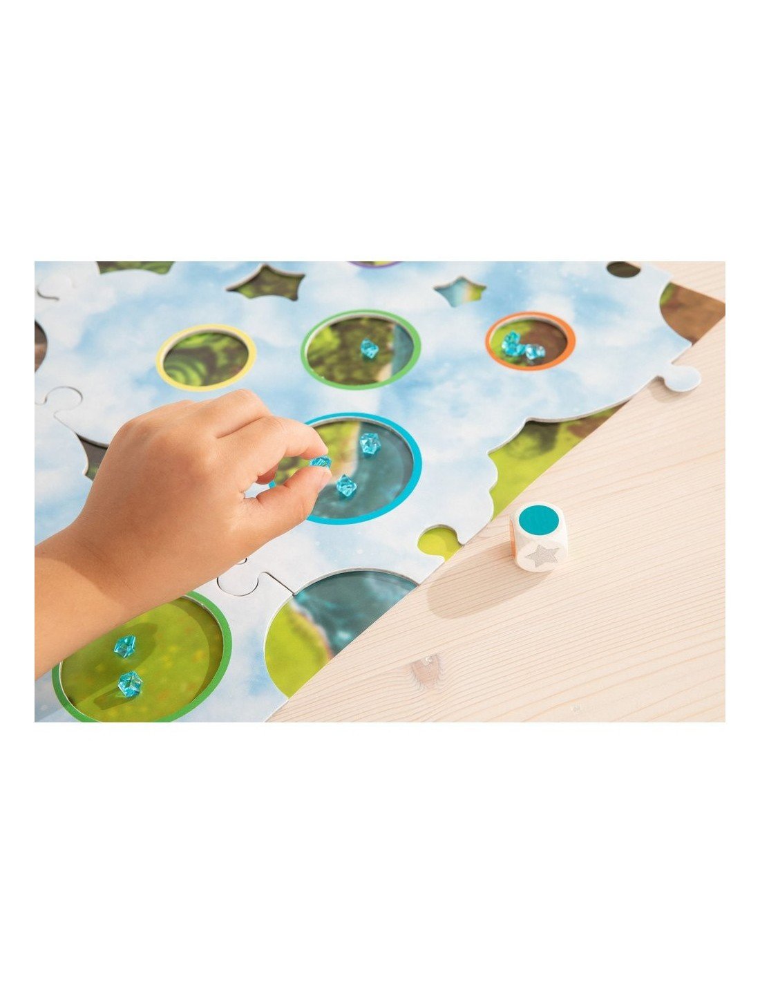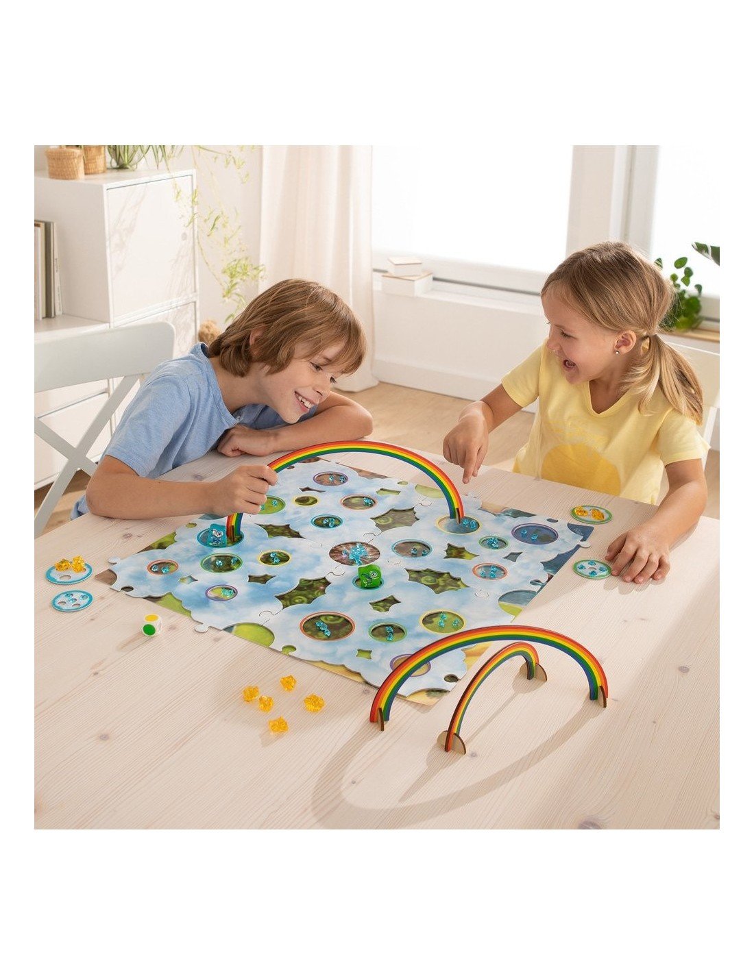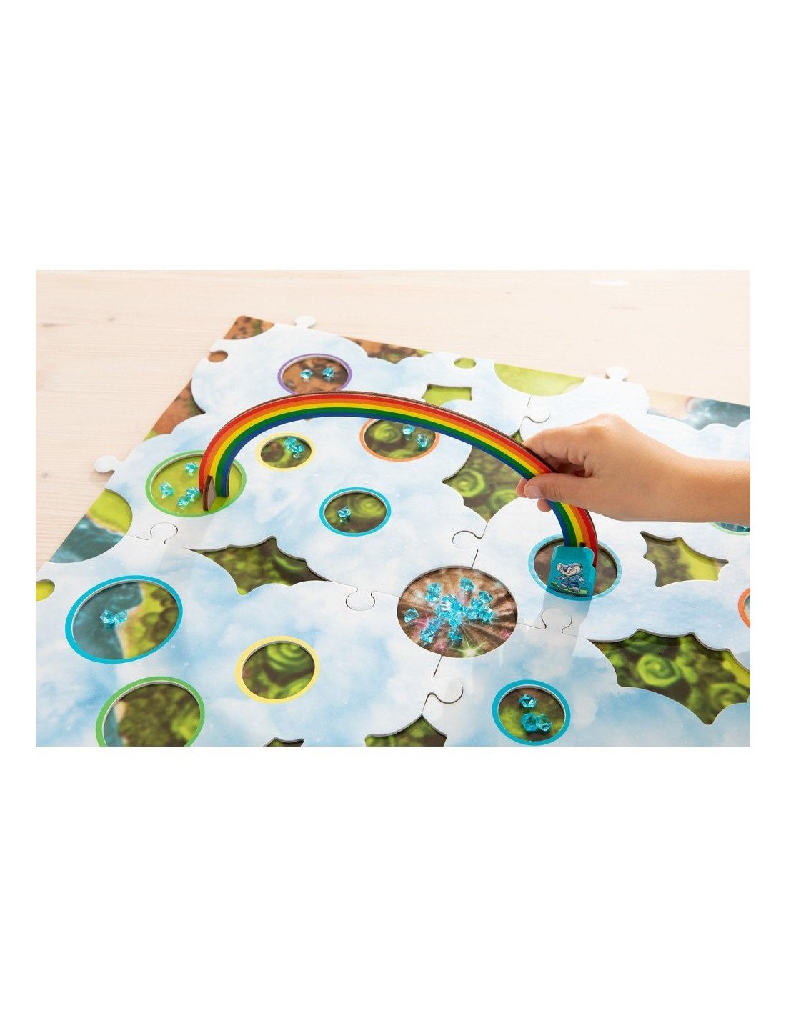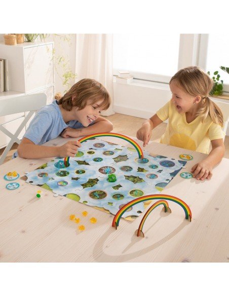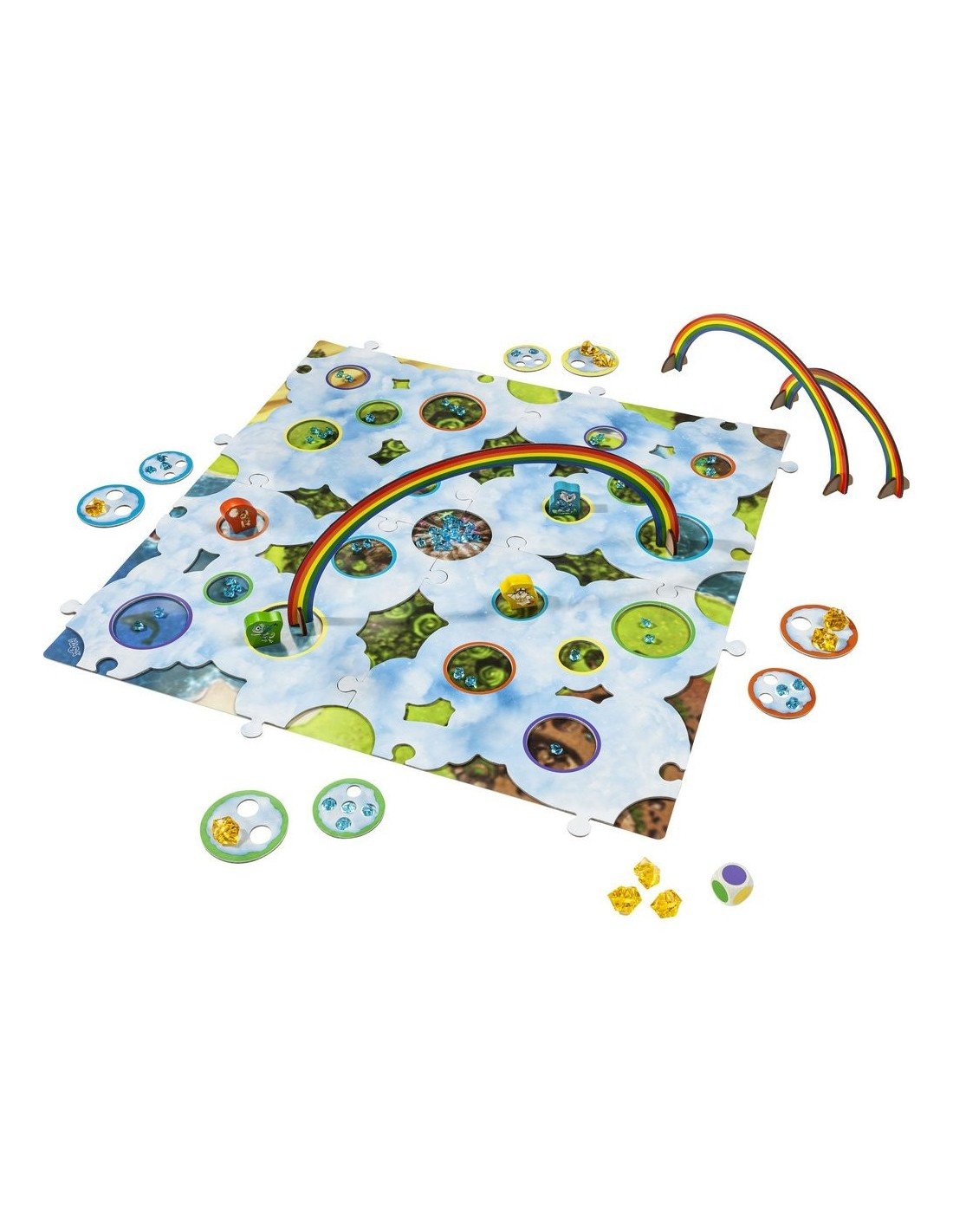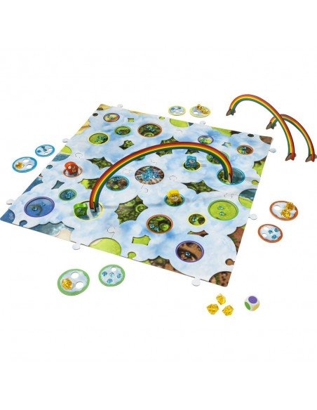 4 medinės Vaivorykštinių Draugų figūrėlės; 1 žaidimo lauko pagrindas; 1 Debesų Šalies laukas (4 dalių); 3 vaivorykštės ( su 2 atraminėm kojelėm kiekviena); 9 auksiniai debesų kristalai; 60 mėlynų debesų kristalų; 1 kaulelis; 8 lobio debesys ( 4 maži ir 4 dideli).