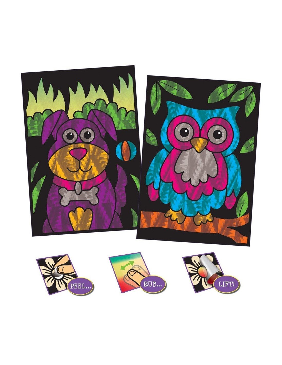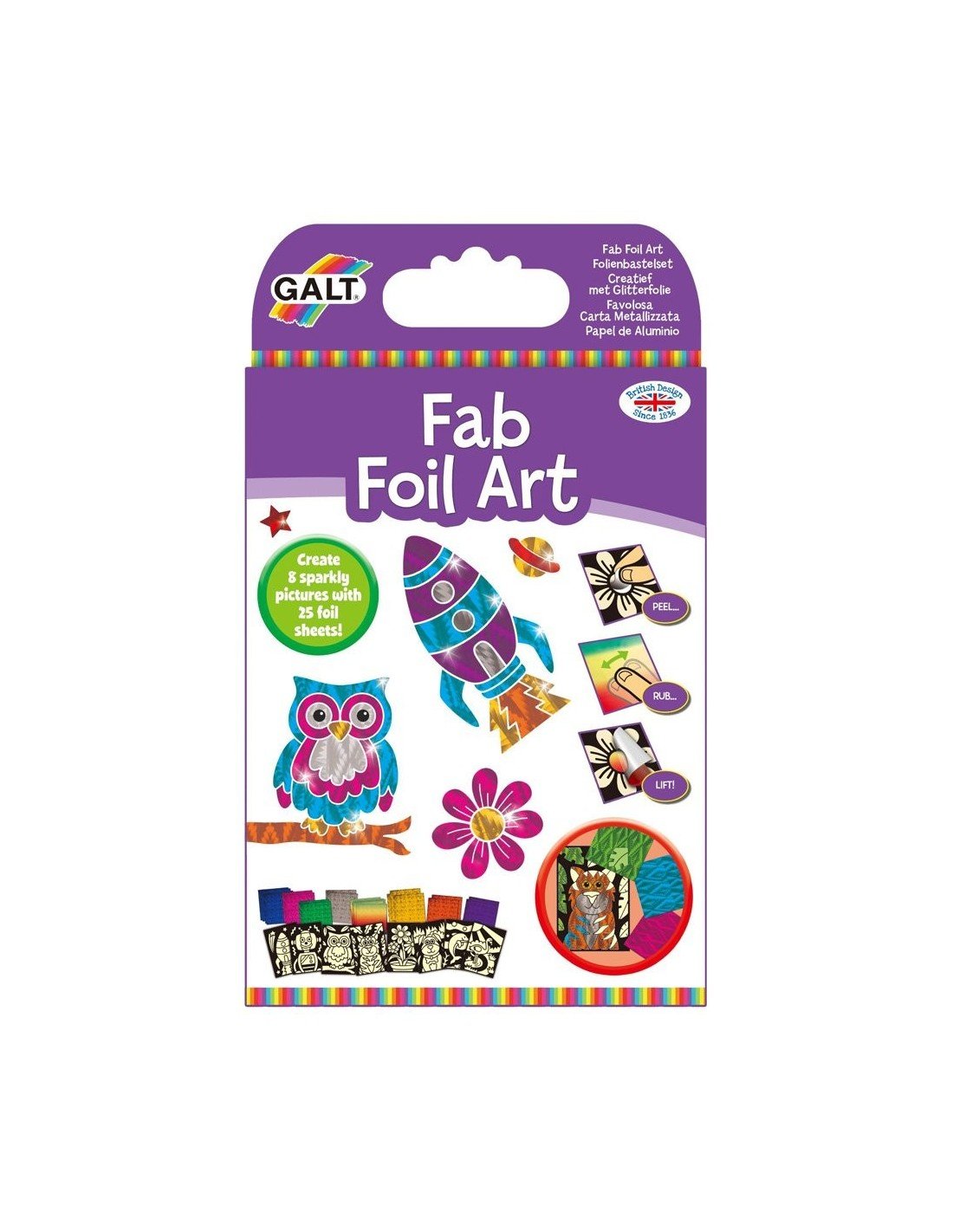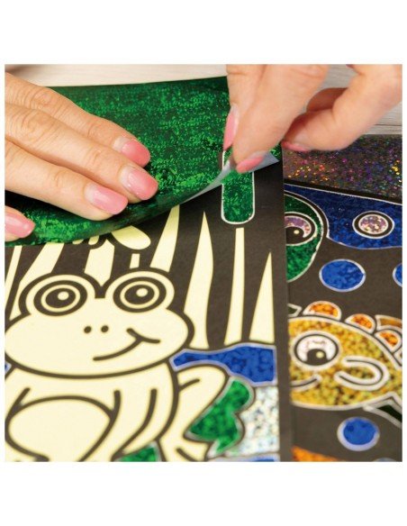 Sukūrkite 8 blizgančius paveikslėlius su šiuo folijos meno rinkiniu. Tiesiog nulupkite paveiksliuko dalį, pridėkite prie jos foliją ir patrinkite pirštu. Pakelkite pridėtos folijos lapą ir jį persikels ant lipnaus paveiksliuko paviršiaus. Sudėtis: 25 folijos asortimento lapai, 8 paveikslėliai (dydžiai 18x12.5 cm), instrukcija.