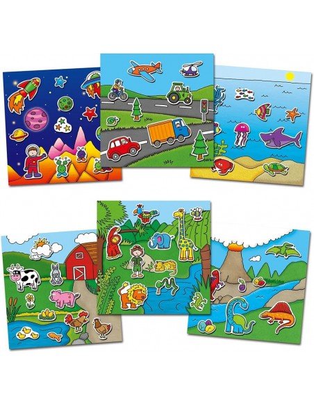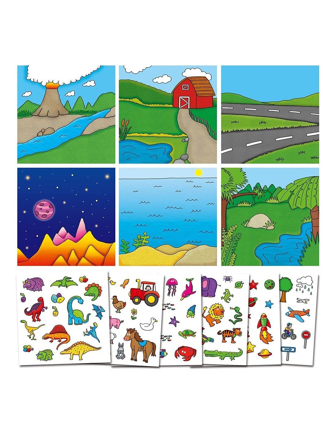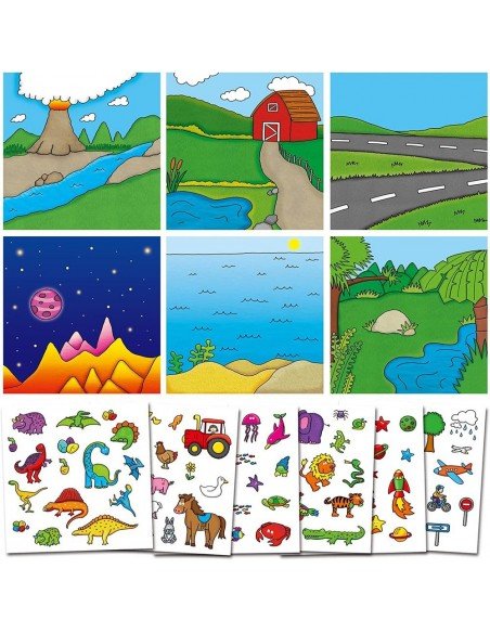 Vaikams patiks sukurti savo istorijas priklijuojant lipdukus ant šešių fonų paveikslėlių. Viniliniai lipdukai yra lengvai priklijuojami ir nulupami net jauniems vaikams. Rinkinis puikiai tinka kelionėms, padeda lavinti rankų miklumą, vaizduotę ir kalbos įgūdžius. Sudėtis: 6 fonų paveikslėliai (dydis apie20x20cm), 6 lipdukų lapai su 100 daugkartinio naudojimo lipdukų.
