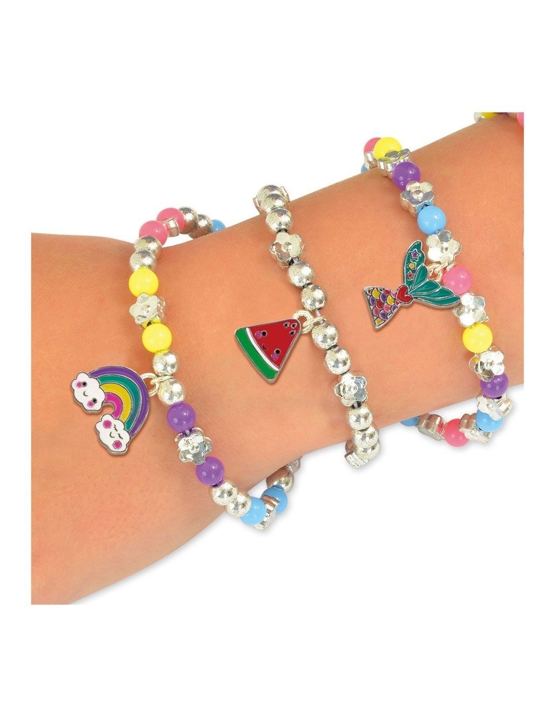 Pasidaryk 7 apyrankes su metaliniais pakabukais. Tiesiog prisek pakabuką prie apyrankės grandinėlės. Suverk sidabrinius ir spalvotus karoliukus ant elastinio siūlo ir uždėk spalvotą pakabuką. Sudėtis: 6 spalvoti metaliniai pakabukai, 3 sidabriniai pakabukai su prisegimais,apyrankės grandinėlė, 300 spalvotų ir sidabrinių karoliukų, elastinis siūlas,adata, siūlas, instrukcija