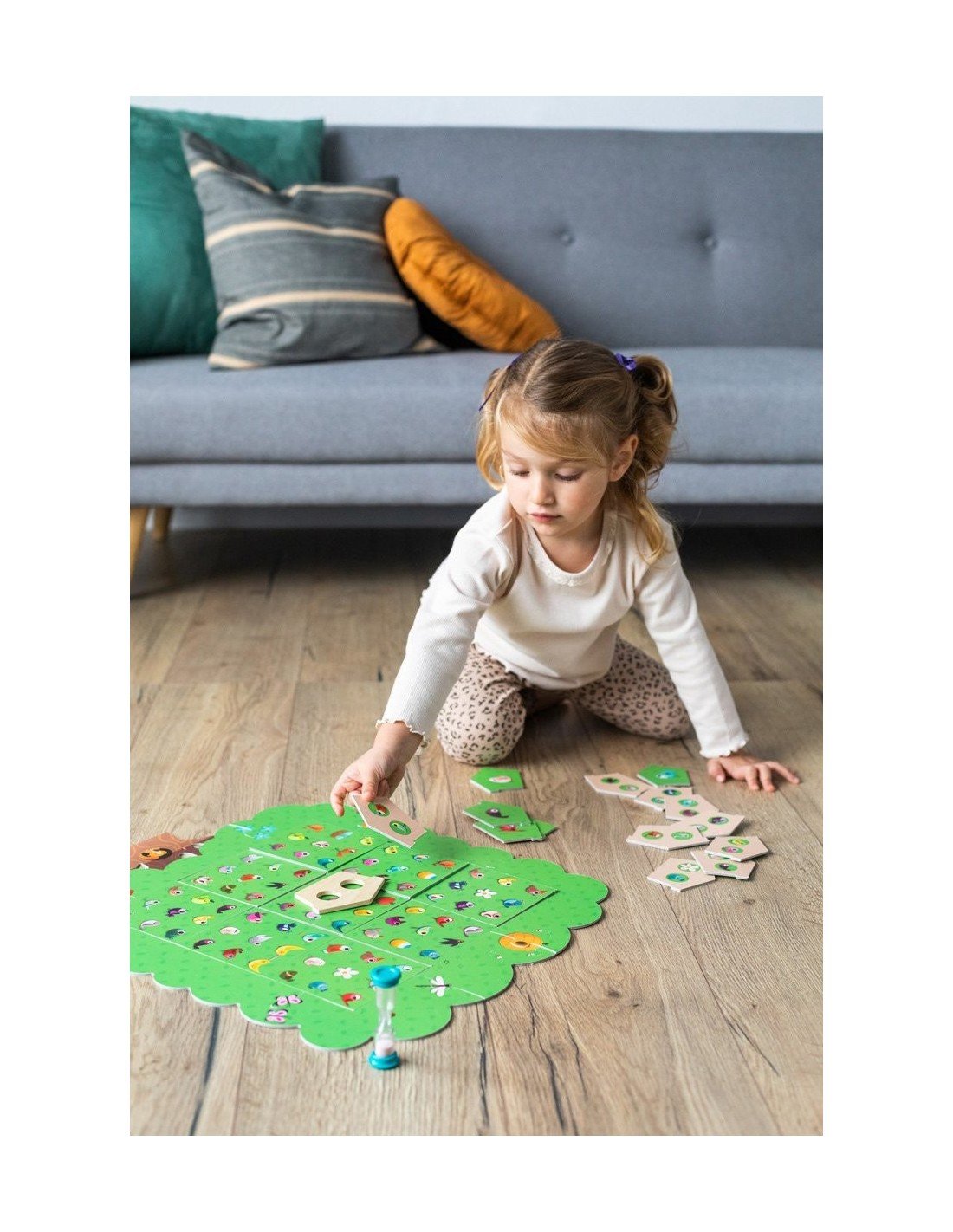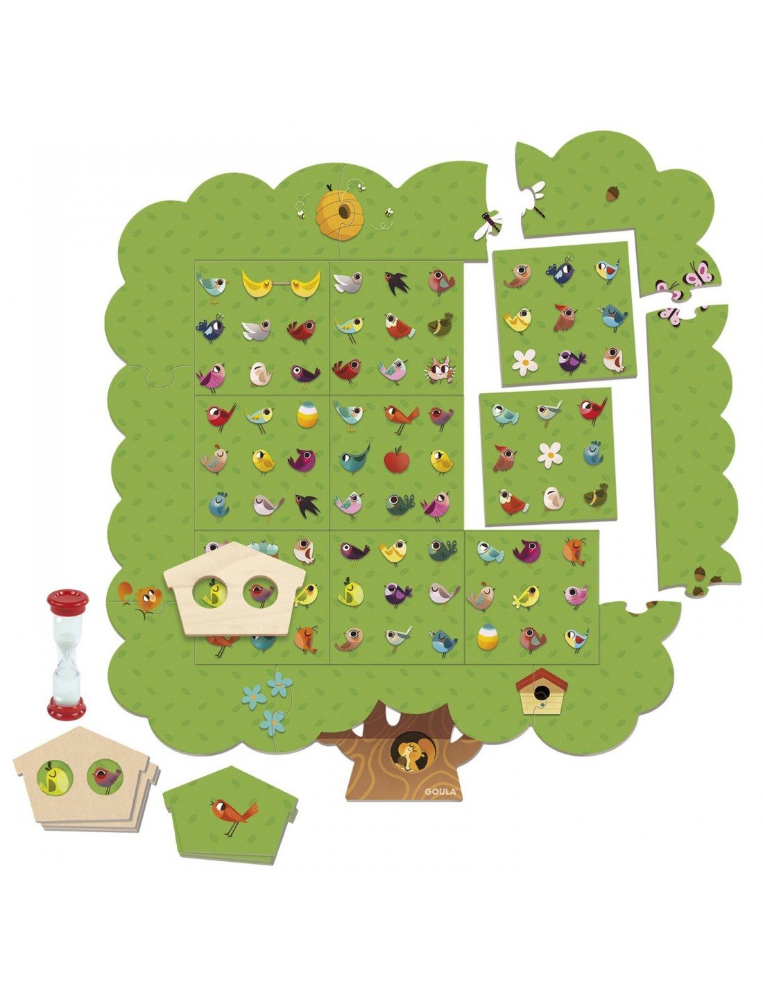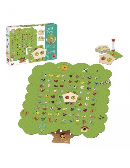 Sudėtis: 17 dalių medis; 24 kortelės; 1 medinis paukščių namelis ir 1 25-sekundžių smėlio laikrodis.