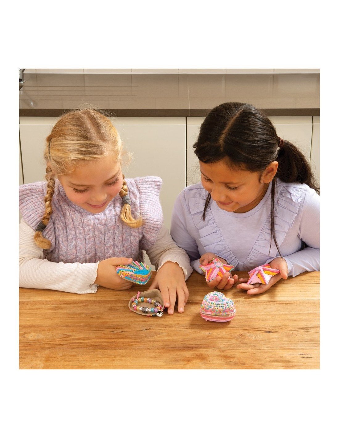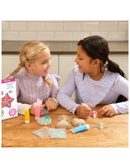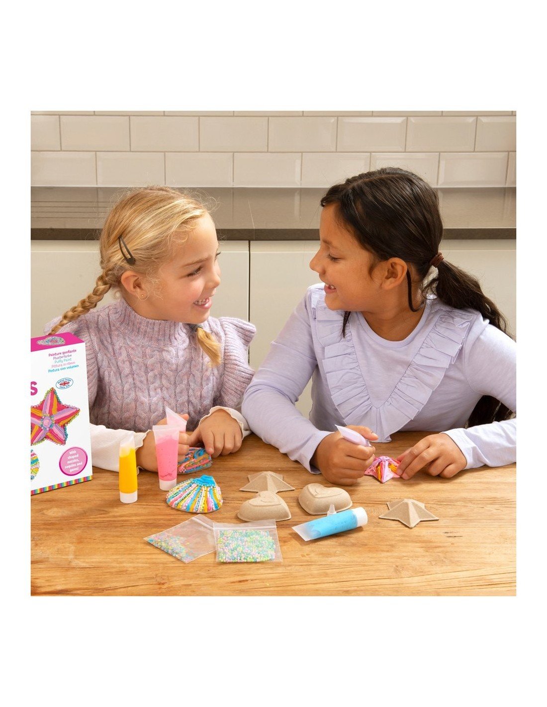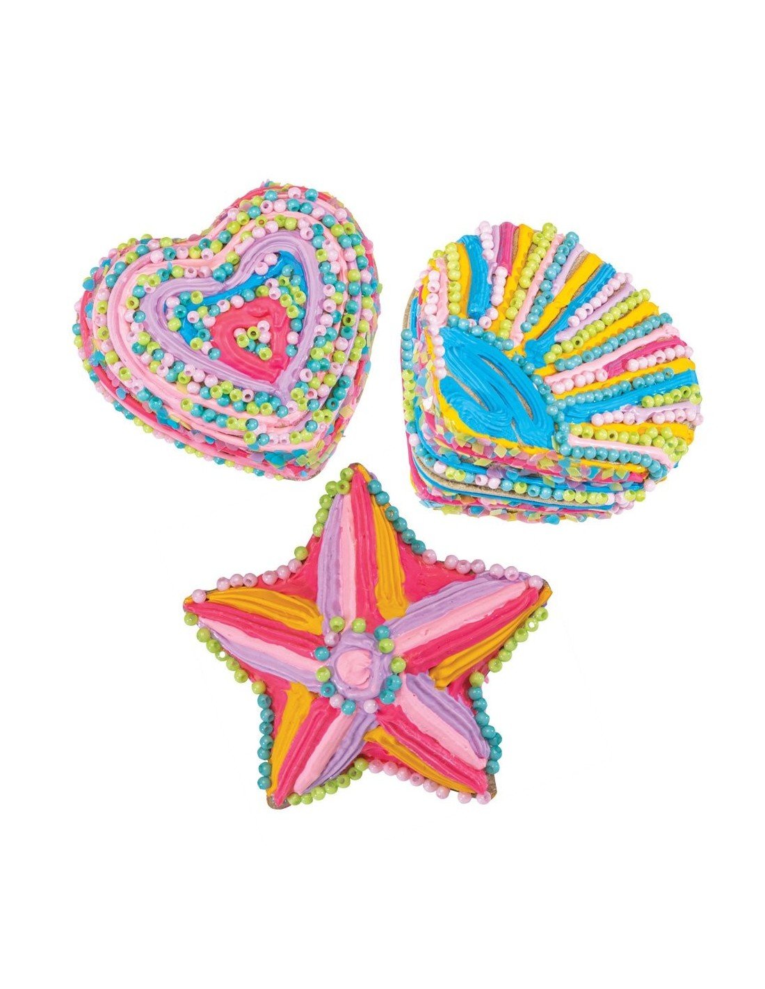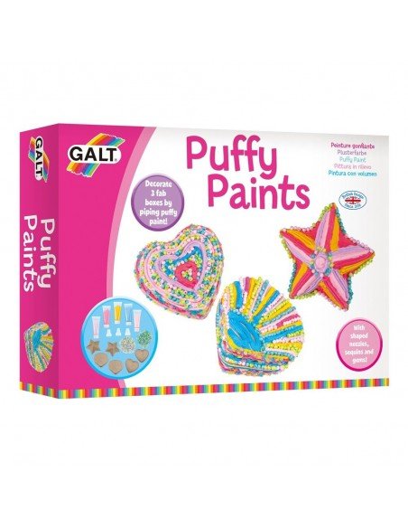 Pūsti dažai. Papuoškite kartonines dėžutes pūstais dažais. Užsukite įvairių raštų antgalius ant dažų tutelių ir užpilkite dažus ant dėžučių dalių. Kol dažai neišdžiūvo, papuoškite blizgučiais ir karoliukais.Sudėtis: 5 tutelės su išspaudžiamais pūstais dažais; 3 kartoninės dėžutės papuošimui: žvaigždė, širdelė ir kriauklė; 3 tutelių antgaliai; blizgučiai; karoliukai, instrukcija.