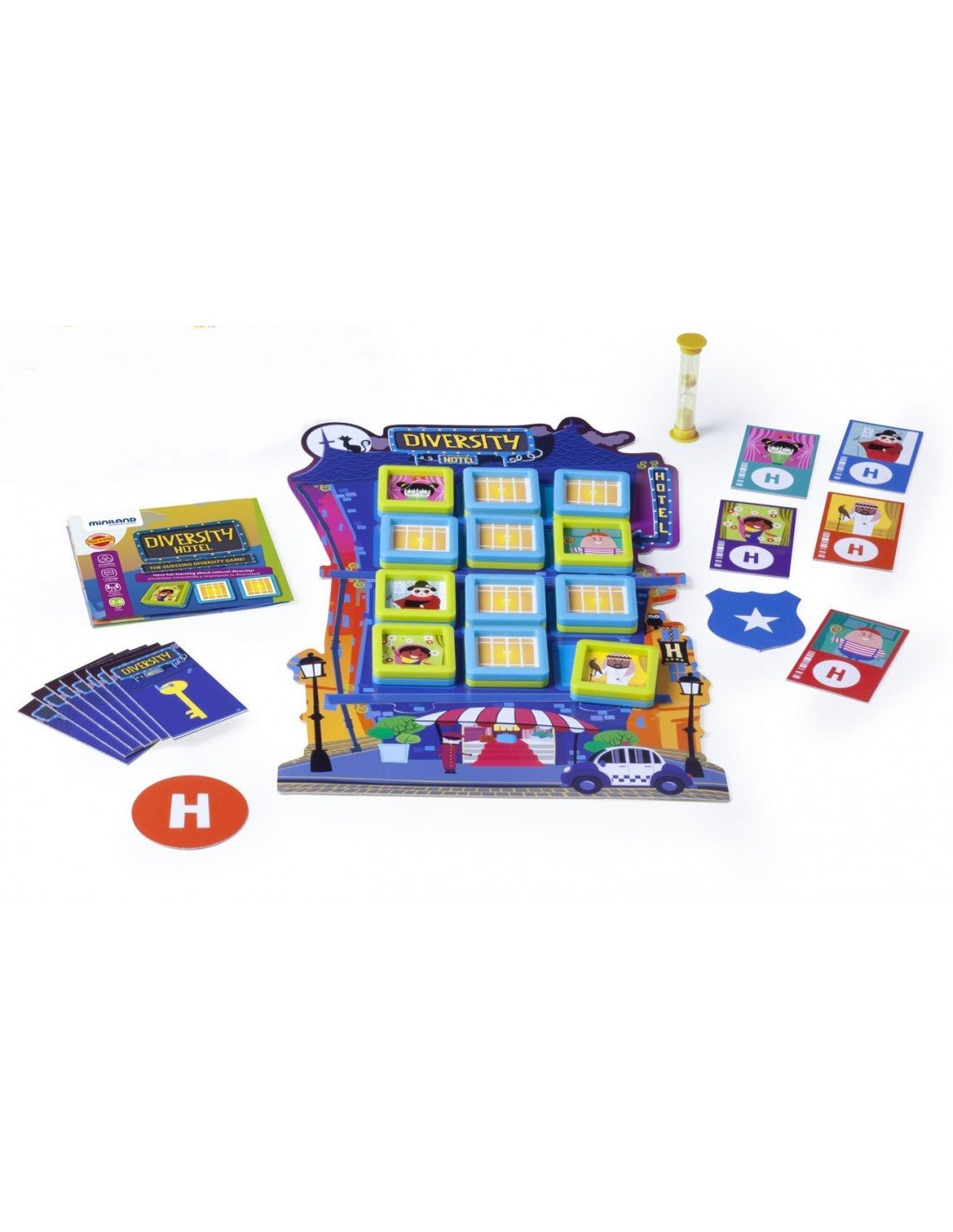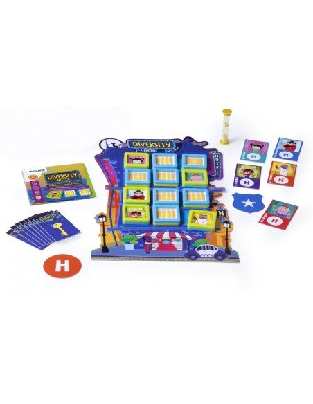 Edukacinis rinkinys DIVERSITY HOTEL, 3 žaidimai,1 žaidimo laukas, 12 langų, 26 kortelės, 1 smėlio laikrodis, 3-6m.