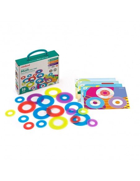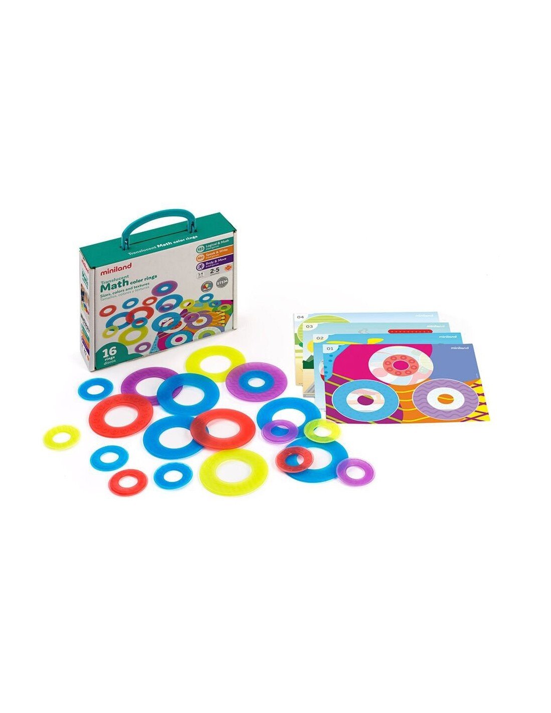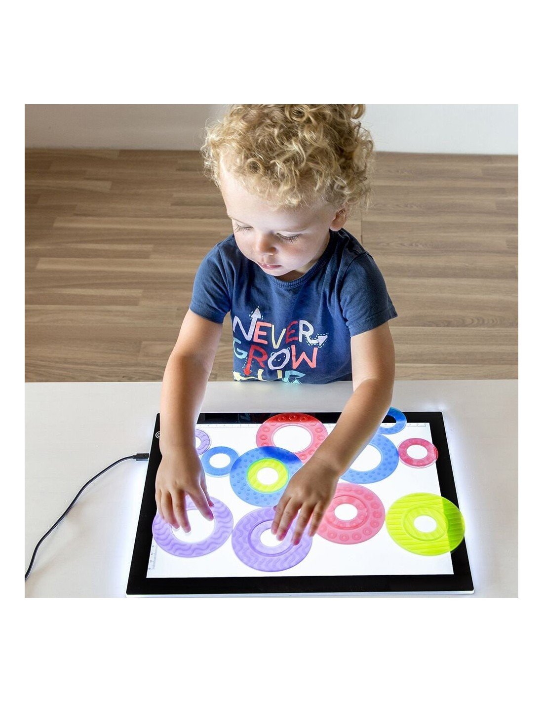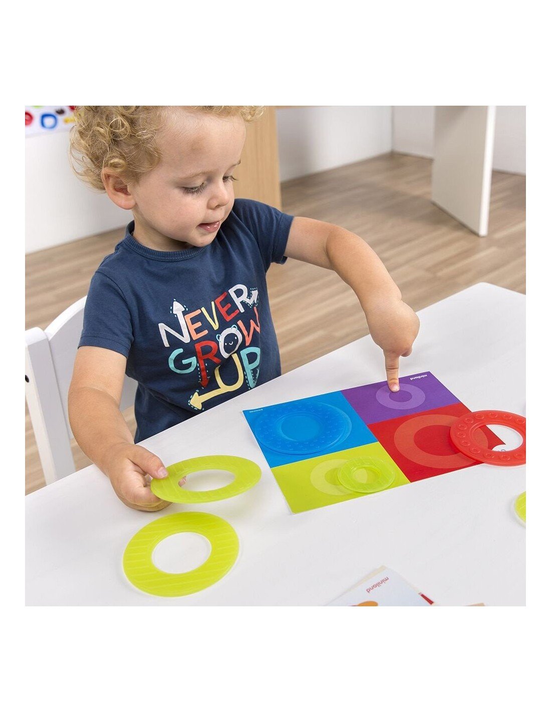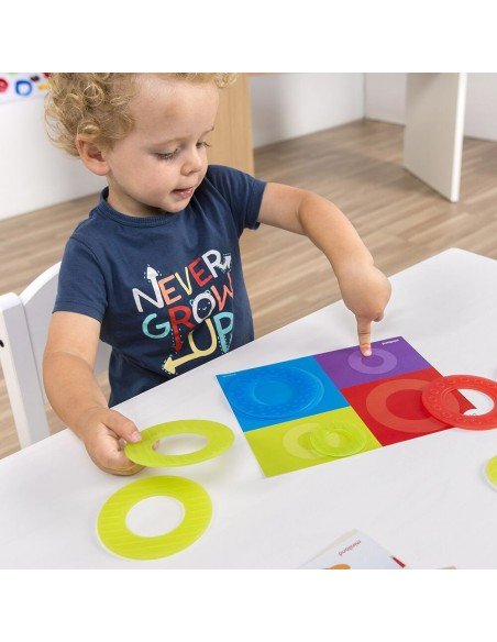 16 peršviečiamų žiedų ir 4 skirtingų temų ir sudėtingumo kortelių rinkinys, su kuriais galėsite diferencijuoti dydžius, spalvas ir tekstūras. Tinka žaisti ant šviesos stalų.