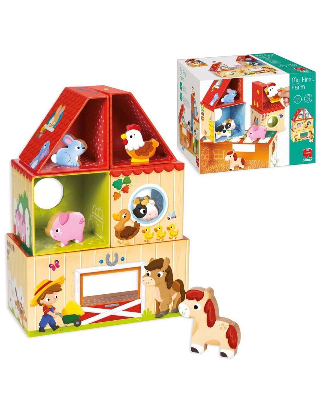 Žaidimas Mano ūkis, 5 mediniai gyvūnai, 5 kambarių (4vnt. - 10x10x10 cm, 1 vnt. - 20x10x10 cm) namo statyba, 12 mėn.+