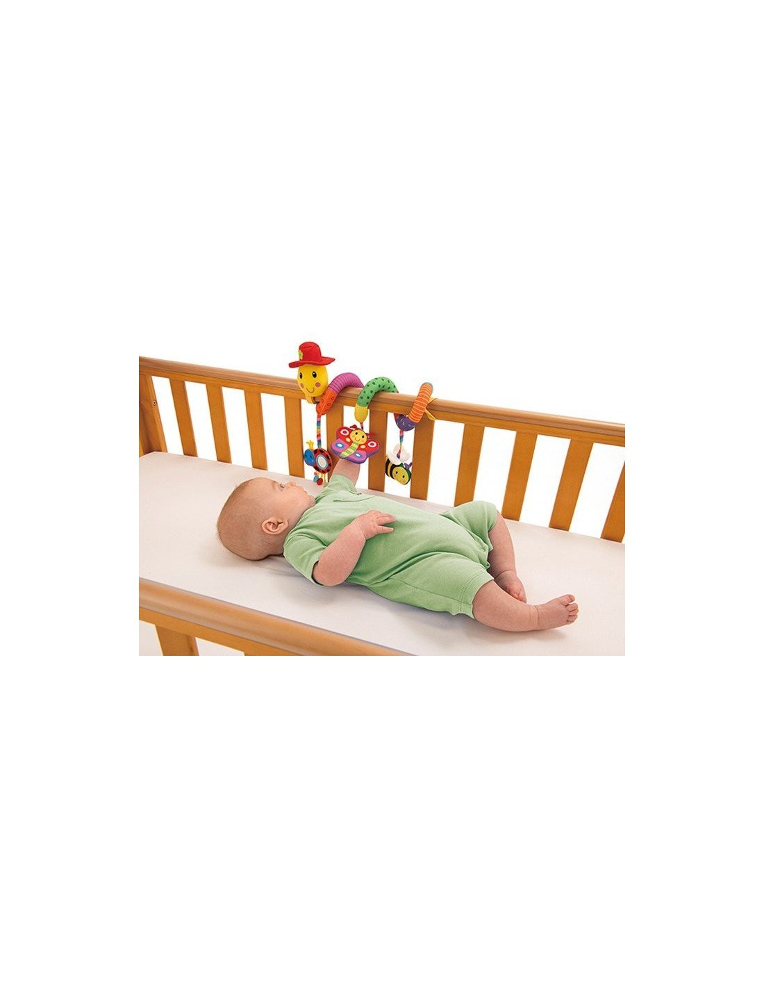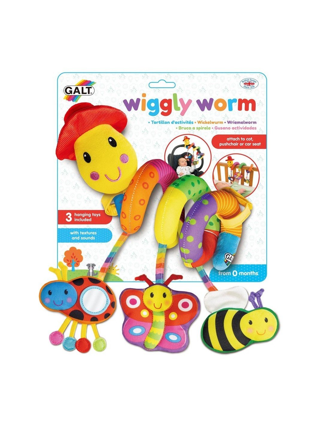 Minkštas draugiškas vikšriukas su 3 pakabinamais žaisliukais tinka pakabinti ant lovytės, vežimėlio arba autokėdutės.Apvyniokite vikšriuką aplink lovytės krašto arba kėdutės rankenos ir užriškite medžiagines juosteles.Vikšriuko kepurė ir drugelis čeža, galvytė cypia, boružėlė turi įtaisytą veidrodį, bitutėje yra barškutis.