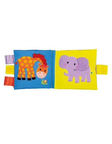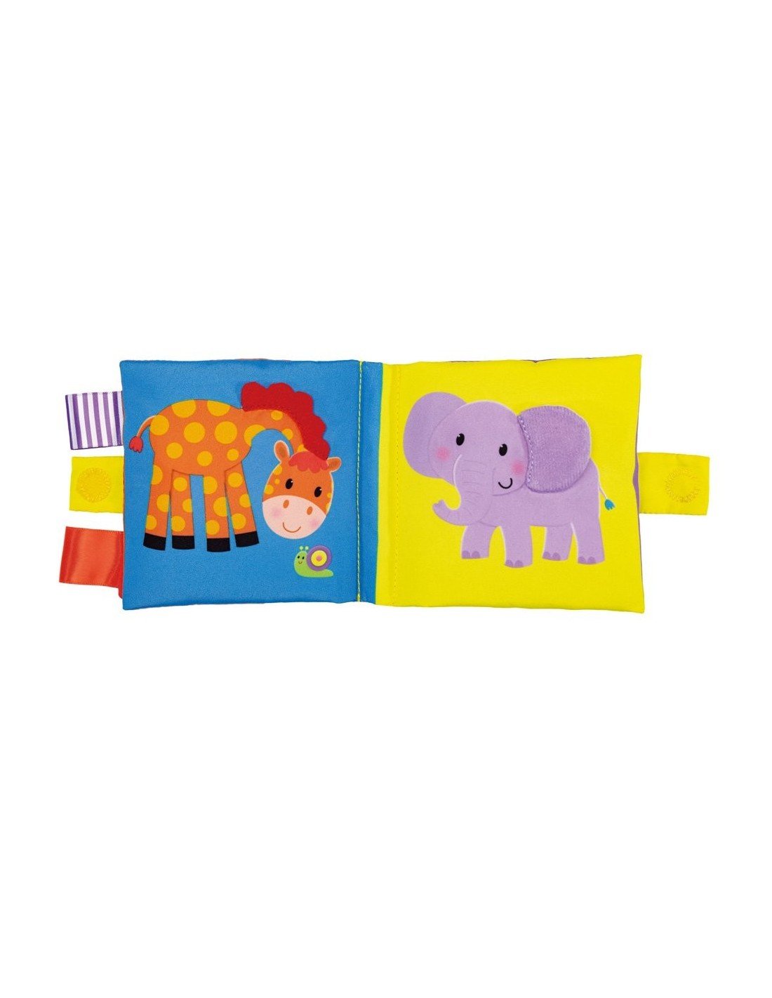 Spalvinga 8 puslapių medžiaginė knygutė su 7 linksmais piešinukais skirta multi-sensoriniam vaiko lavinimui. Minkšti puslapiai pripildyti čežančios medžiagos.Plastikinė rankenėlė leidžia prikabinti knygutę prie vežimėlio rankenos.Minkšta,saugi, skalbiama.
