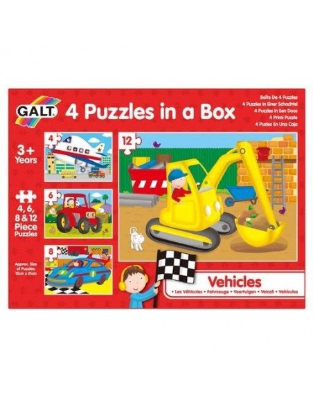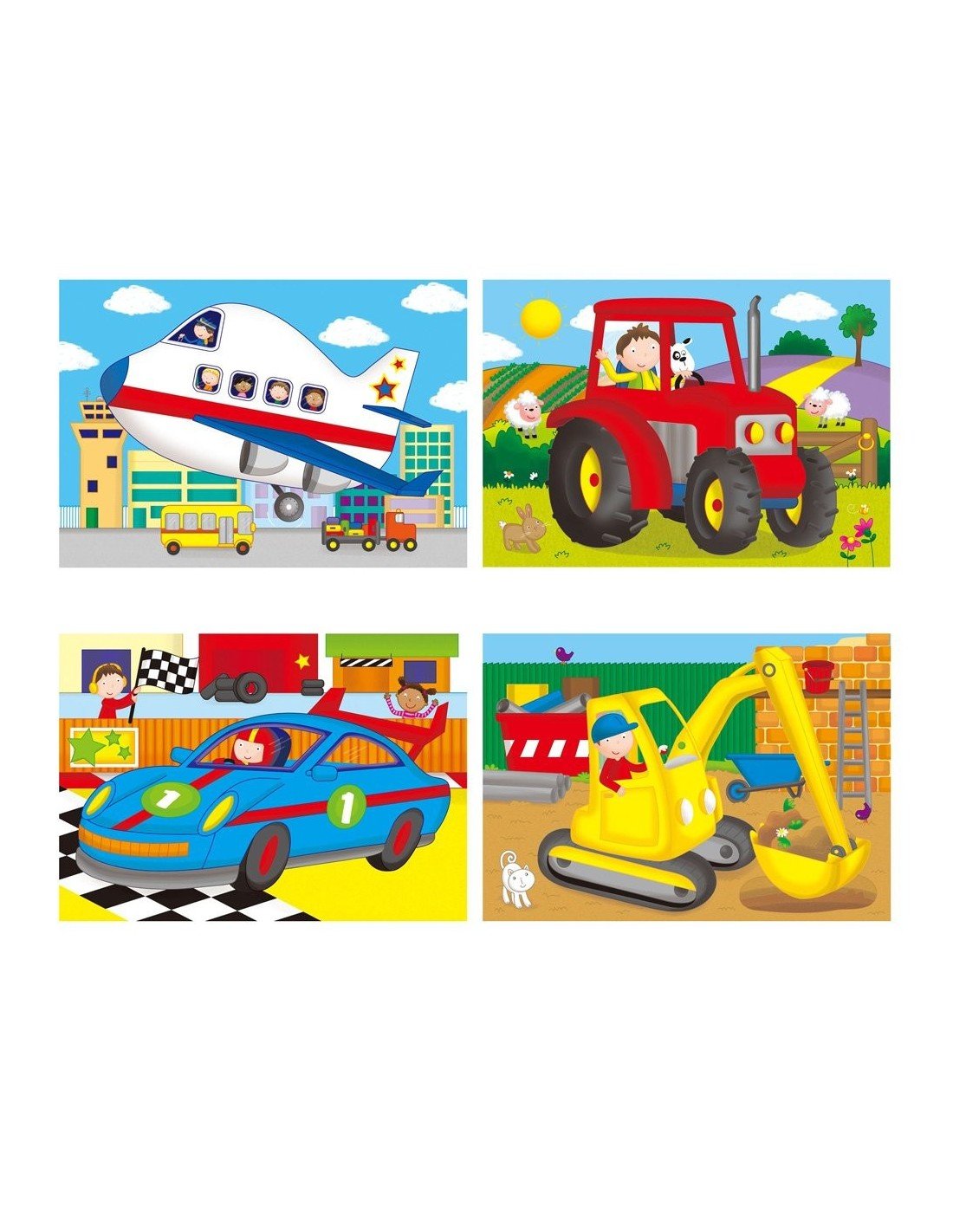 4 spalvotos dėlionės, kiekviena turi skirtingą dalių skaičių - tai skatina vaiko rūšiavimo ir grupavimo įgūdžius. Yra 2 delionių rinkiniai - vienas - su gyvūnų ir jų jauniklių piešiniais, kitas - su įvairiomis transporto priemonėmis: žemės bei oro. Kiekviename rinkinyje yra 4 delionės iš 4, 6, 8 ir 12 dalių. Visų j išmatavimai: 152x215 mm.