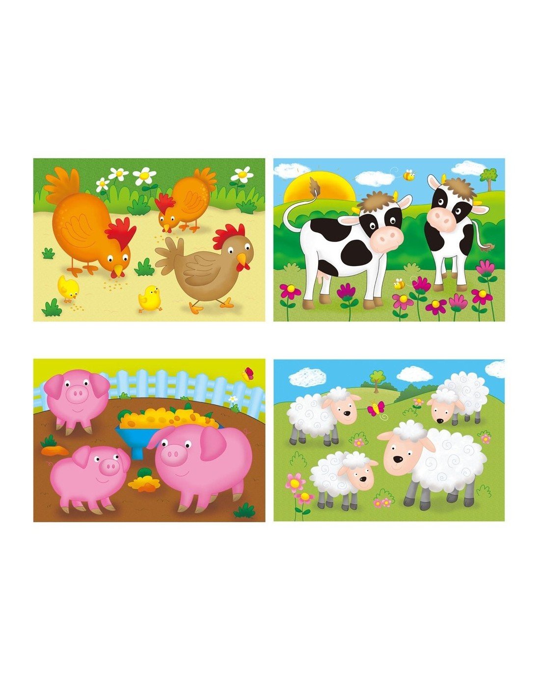 4 spalvotos dėlionės, kiekviena turi skirtingą dalių skaičių - tai skatina vaiko rūšiavimo ir grupavimo įgūdžius. Yra 2 delionių rinkiniai - vienas - su gyvūnų ir jų jauniklių piešiniais, kitas - su įvairiomis transporto priemonėmis: žemės bei oro. Kiekviename rinkinyje yra 4 delionės iš 4, 6, 8 ir 12 dalių. Visų j išmatavimai: 152x215 mm.
