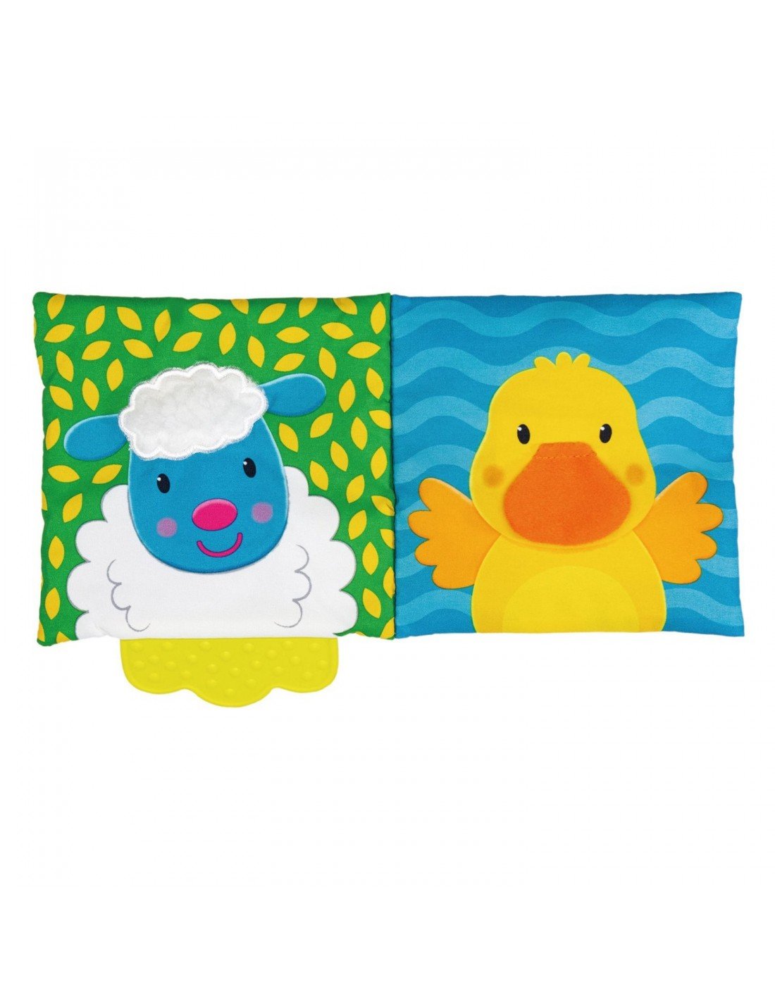 Spalvota, medžiaginė knygūtė su pypsinčią gyvūnėlio galvyte ir kramtuku. Ant kiekvieno iš 8 traškančių puslapių rasite veiklą ar medžiagą tyrinėjimui. Žaislas yra minkštas, saugus ir jį galima skalbti.