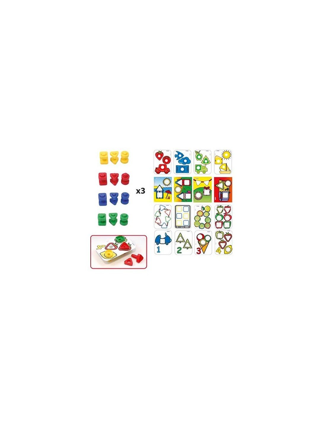Dalis galima susukti tik tuo atvėju, jeigu jos turi tą pačią formą. Rinkinyje taip pat rasite 4 skirtingų veiklų tipus, pavaizduotus spalvimgais paveikslais ant labai patvarių, plastikinių kortelių. Ant kortelių pavaizduotos užduotys buvo išbandytos mokykluose ir labai gerai įvertintos. Jos padeda išmokti atpažinti spalvas ir formas. Sudėtis: 16 kortelių, 72 susukamos dalys (36 varžtai, 36 veržlės).